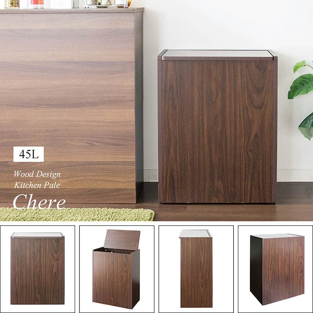 毎日使うキッチンだから見た目もこだわりたい。そんな方にピッタリの木製キッチンペール『Chere(シェール)』。ゴミ箱だと分かりにくいスタイリッシュなデザインでキッチンに馴染みます。 たっぷり入る45Lで、ニオイ漏れを防ぐフタや移動がラクにできる隠しキャスター付きで利便性も抜群。横置き・縦置きどちらも可能で省スペースなのでキッチンやカウンターの隙間に置けます。 お部屋に馴染みやすい木目柄のホワイト、ナチュラル、グレージュ、ブラウン、無地のモカの5カラーをご用意。お好みでお選びください。 製品重量:11kg