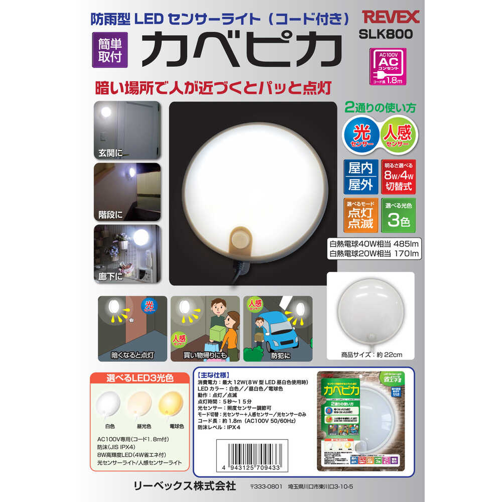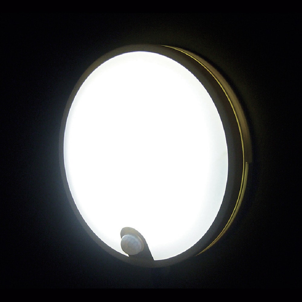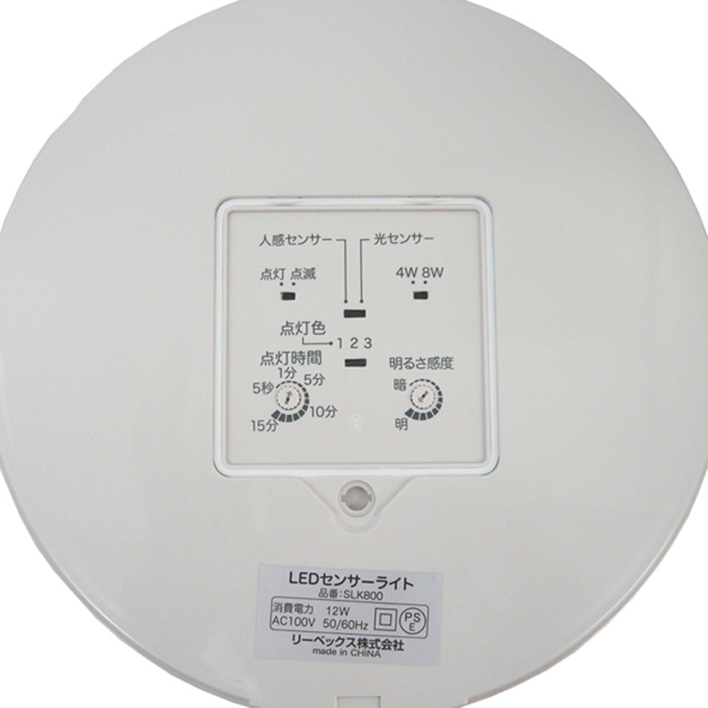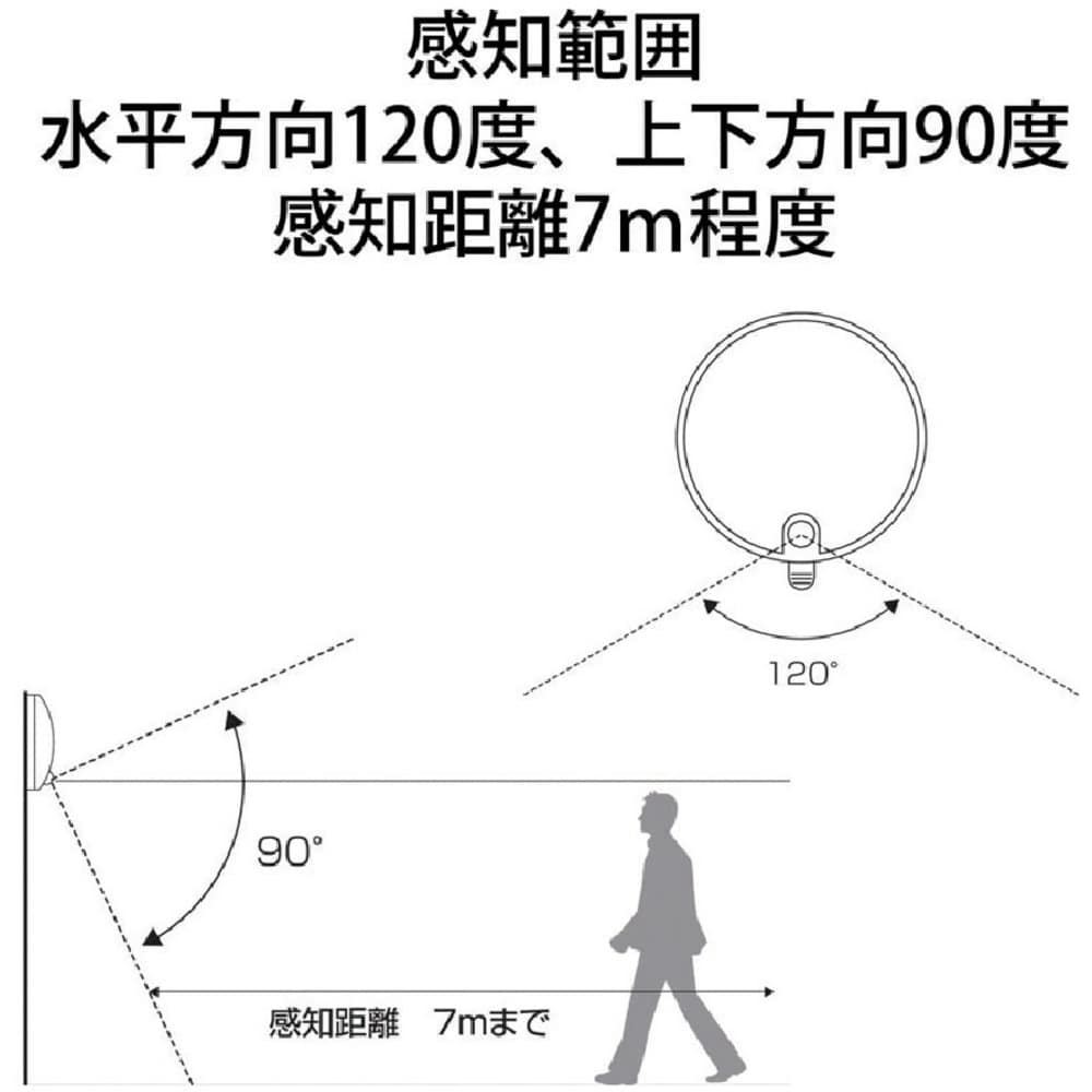 ●玄関や階段、廊下などに設置すれば、暗い時に人が近づくと人感センサーが感知して自動で点灯し、5秒~15分で消灯します。●明るさセンサーモードにすれば、暗くなると自動で点灯し、明るくなると消灯します。●防雨型なので、屋外の軒下でも使用可能です。●納戸やクローゼットに入ったら自動点灯で便利です。●幅(mm):220●奥行(mm):64●高さ(mm):220●光源色:白色/昼光色/電球色●使用電球(W):LED8W/4W●消費電流(W):12W/LED8W時●電源:AC100V 50/60Hz●点灯保持時間:5秒~15分●明るさ(lm):485lm/8W時 170lm/4W時●電源(V):AC100V 50/60Hz●明るさ:8W(白熱電球40W相当)/4W(白熱電球20W相当)切り替え式●LED光色:白色/昼光色/電球色●点灯モード:点灯または点滅●設置方法:取り付け用プレートを壁に取り付けてから、ライトをプレートにはめ込みます(付属の両面テープまたは木ネジ)。●商品サイズ:直径約22cm●消費電力:最大12W(8W型 LED昼光色使用時)●点灯時間:5秒~15分 質量570g