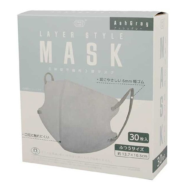 ●口元に触れず息がしやすい立体3層不織布マスク ●軽い付け心地で肌にもなじむオシャレなくすみカラー ●顔の形にぴったりフィットで耳に優しい6mm幅ゴム ●30枚入りで日常使いしやすい価格帯 ●W13.7cm×10.5cmのレギュラーサイズでユニセックス対応 ●カラー:アッシュグレー