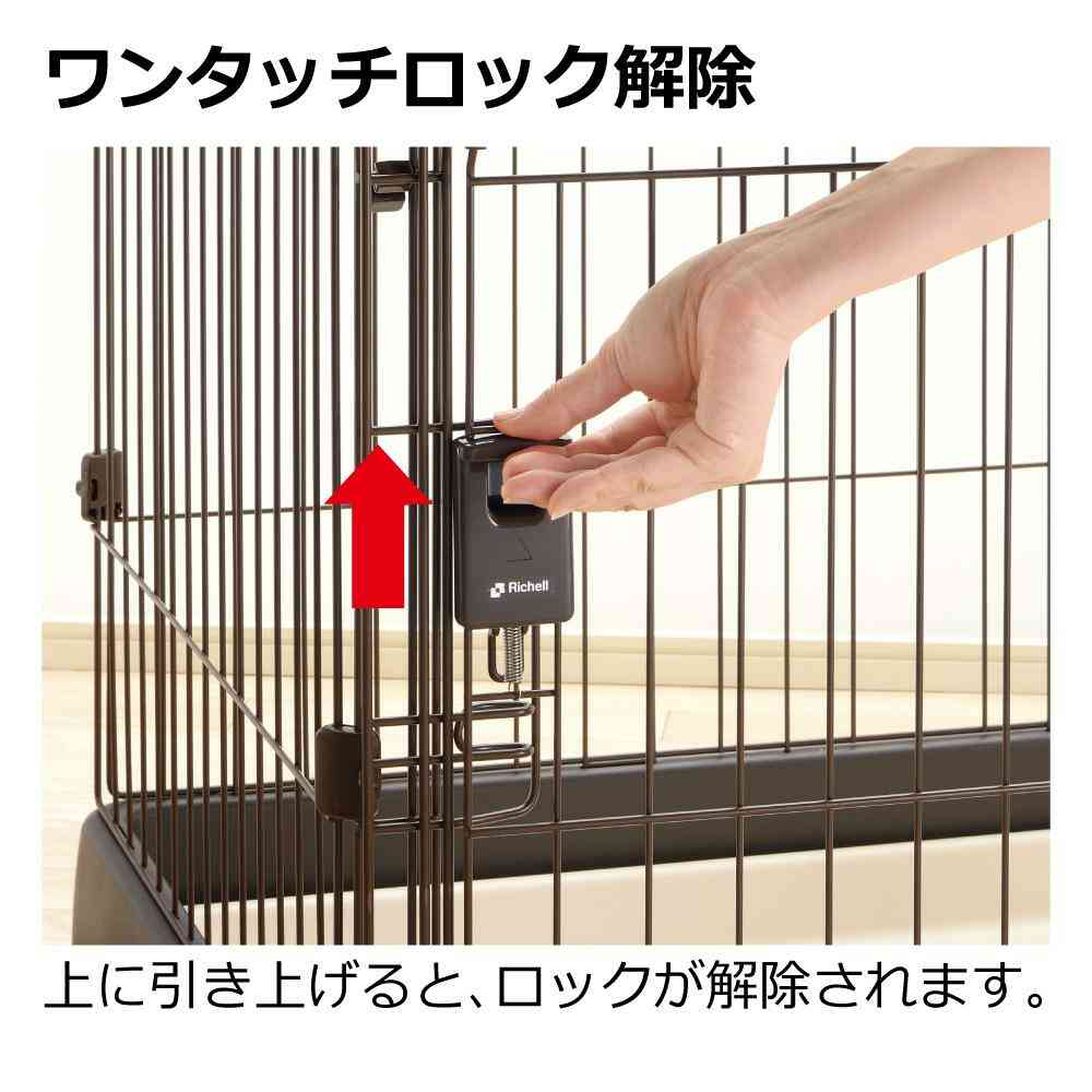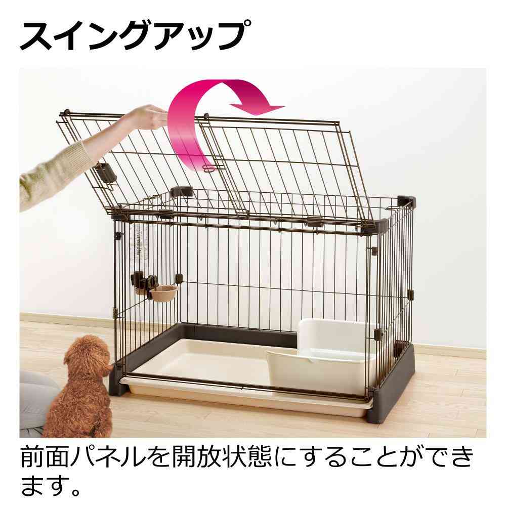 ・前面パネルをスイングアップして、開放状態にすることができ、サークル内の物の出し入れがしやすく、ラクにお掃除できます。 ・本体を移動させずに、トレーのお手入れができます。(前面パネル開放時) ・適応体重:8kg以下 ・適応種:超小型犬、小型犬