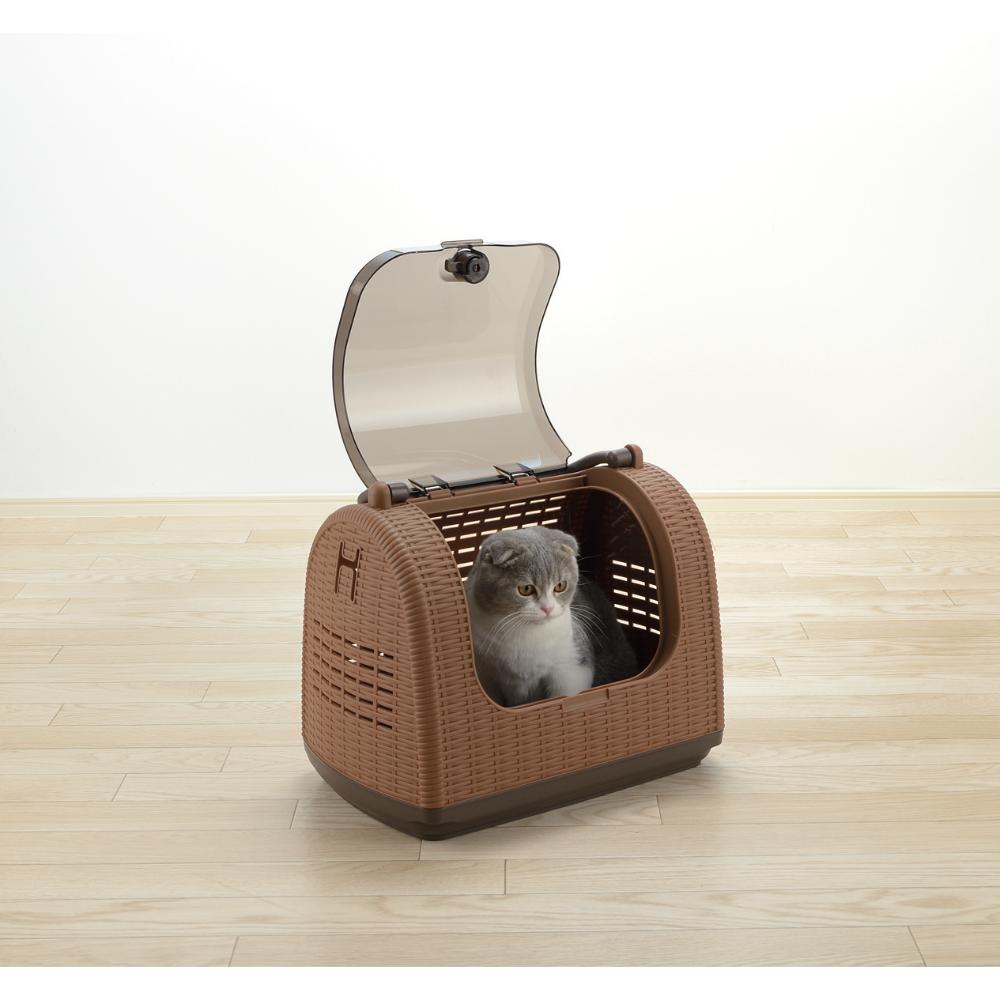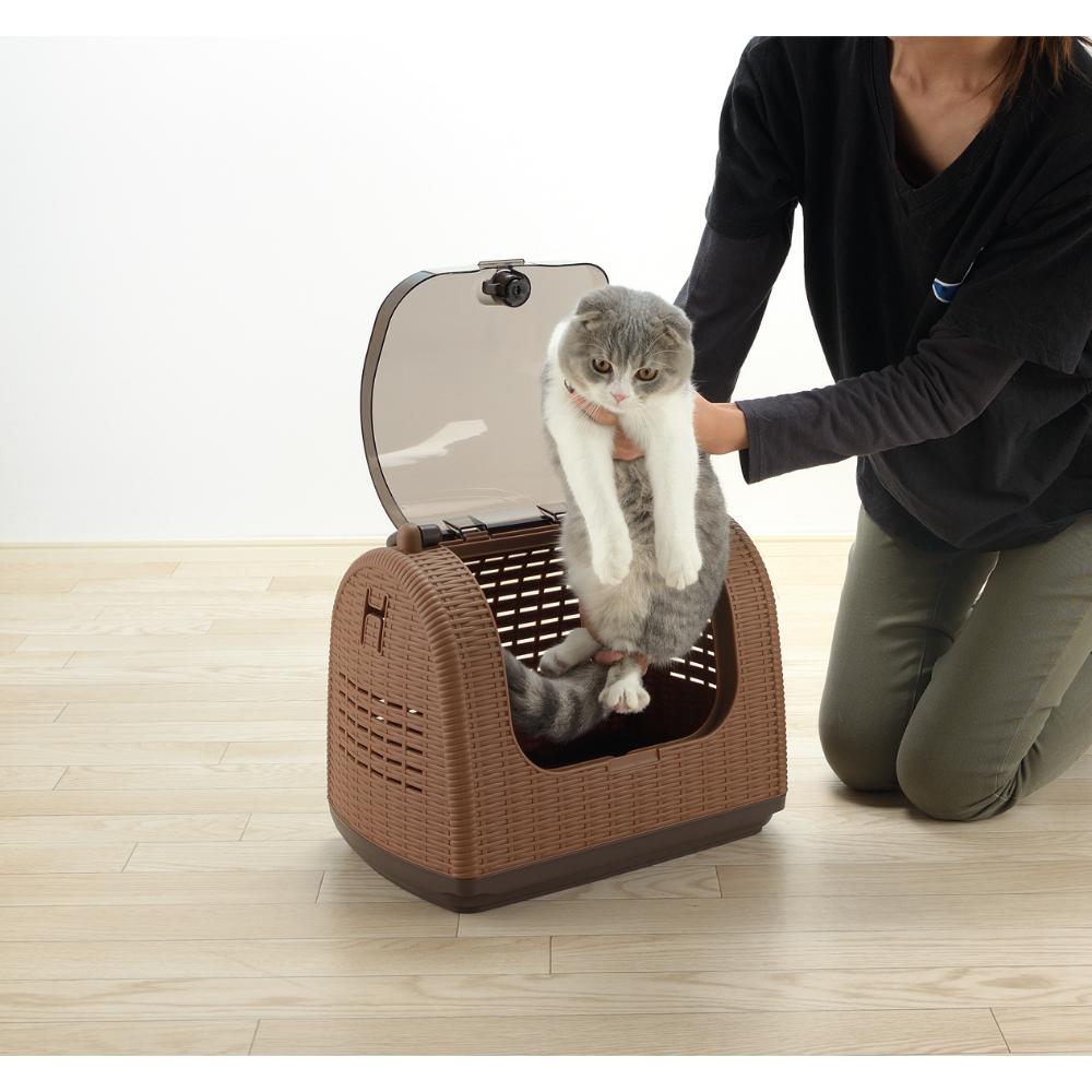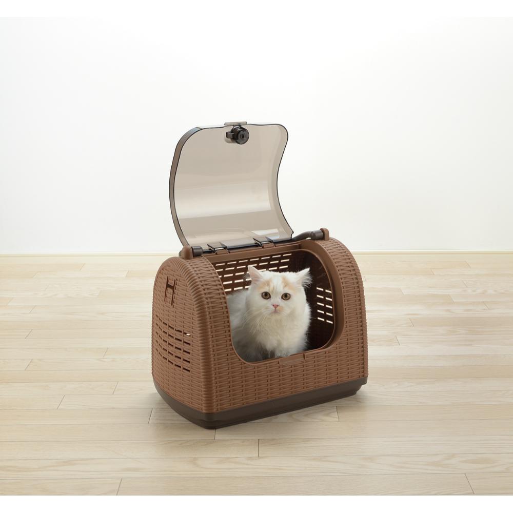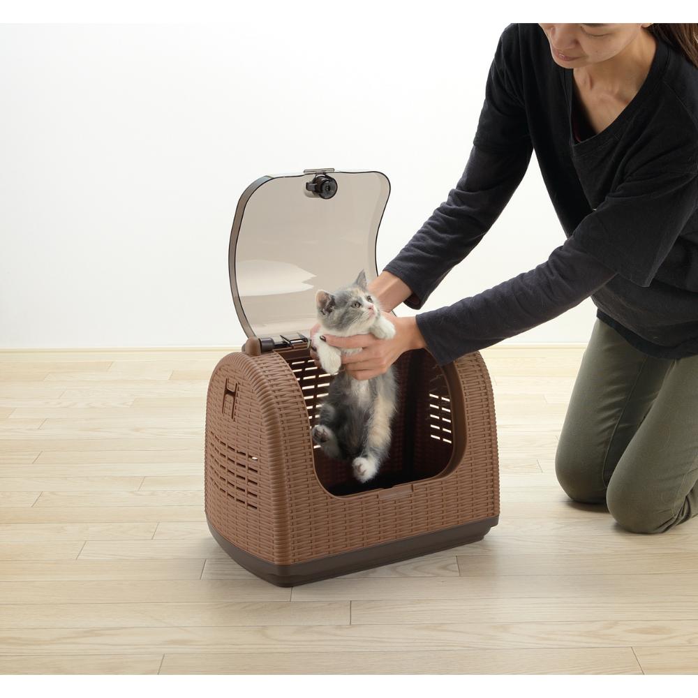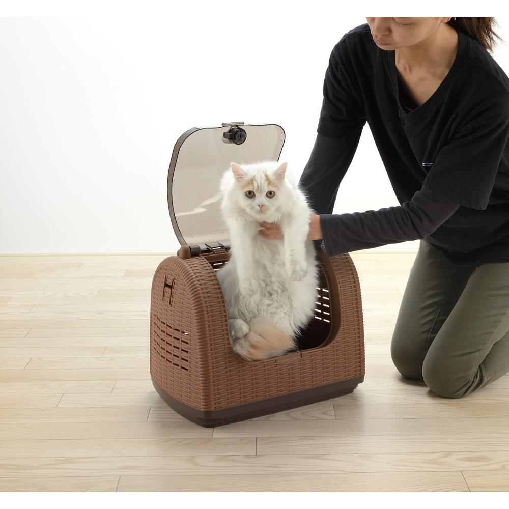 ・開口部が広く、出し入れラクラク!ラタン風のおしゃれなキャリーです。通気性を考慮した快適設計です。 ・引っ掛け部に掛けるだけで、簡単に取り付け、シートベルト固定機能付きです。 ・ドアの開け閉めがしやすい、手掛け部付きです。ドアは簡単にロック・解除できます。 ・持ち運びしやすい、大きめのハンドルです。 ・適応体重:5kg以下(超小型犬・猫・うさぎ用)