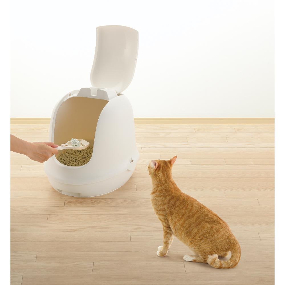 猫砂の飛び散りを軽減するフード付きタイプのネコトイレです。 ■お手入れしやすい広い開口部:フードを外さなくても、トイレ内のお手入れがラクにできます。 ■スコップ付き:スコップはフード部にスッキリ収まります。 ■お手入れ簡単:プラスチック製なので、水洗いが出来てお手入れ簡単