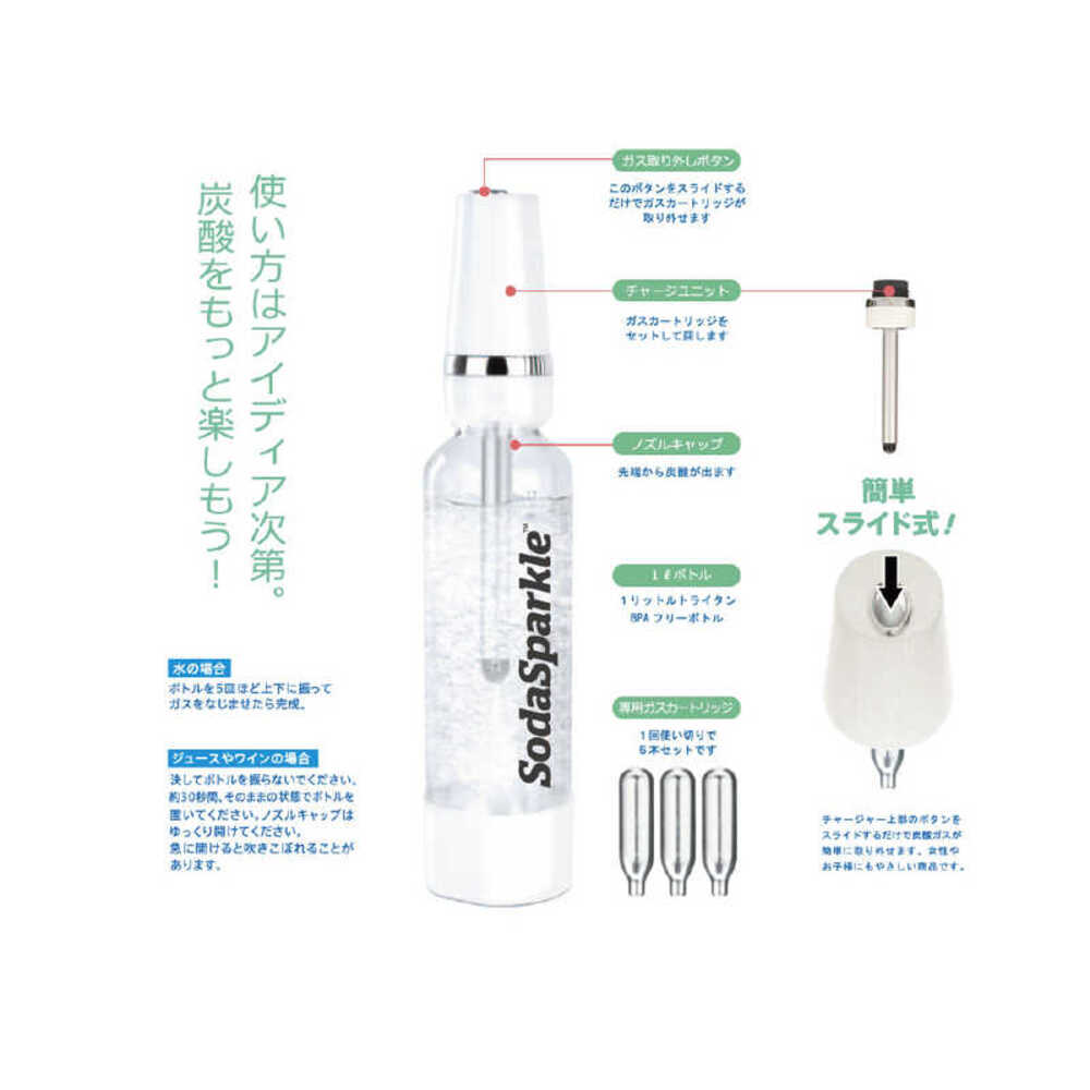 ●ボトル素材は、耐熱性・強度に優れたトライタンを使用。ボトルは、食洗機(低温モード)対応、熱湯消毒可能。 ●誰でも簡単に3ステップで簡単に炭酸水が作れます ●電源不要で持ち運べるので、普段使いはもちろんですがピクニック・グランピングなどでも大活躍します。 ●専用ガスカートリッジ1本で、水(1?)ジュースや白ワイン(650ml)炭酸水が作れます。 ●炭酸水を料理にも使えるレシピブック付き ●専用ガスカートリッジは、使用後そのまま不燃用ゴミで処分可能です。 ●購入してすぐ使えるレシピブック・ガスカートリッジ5本付属