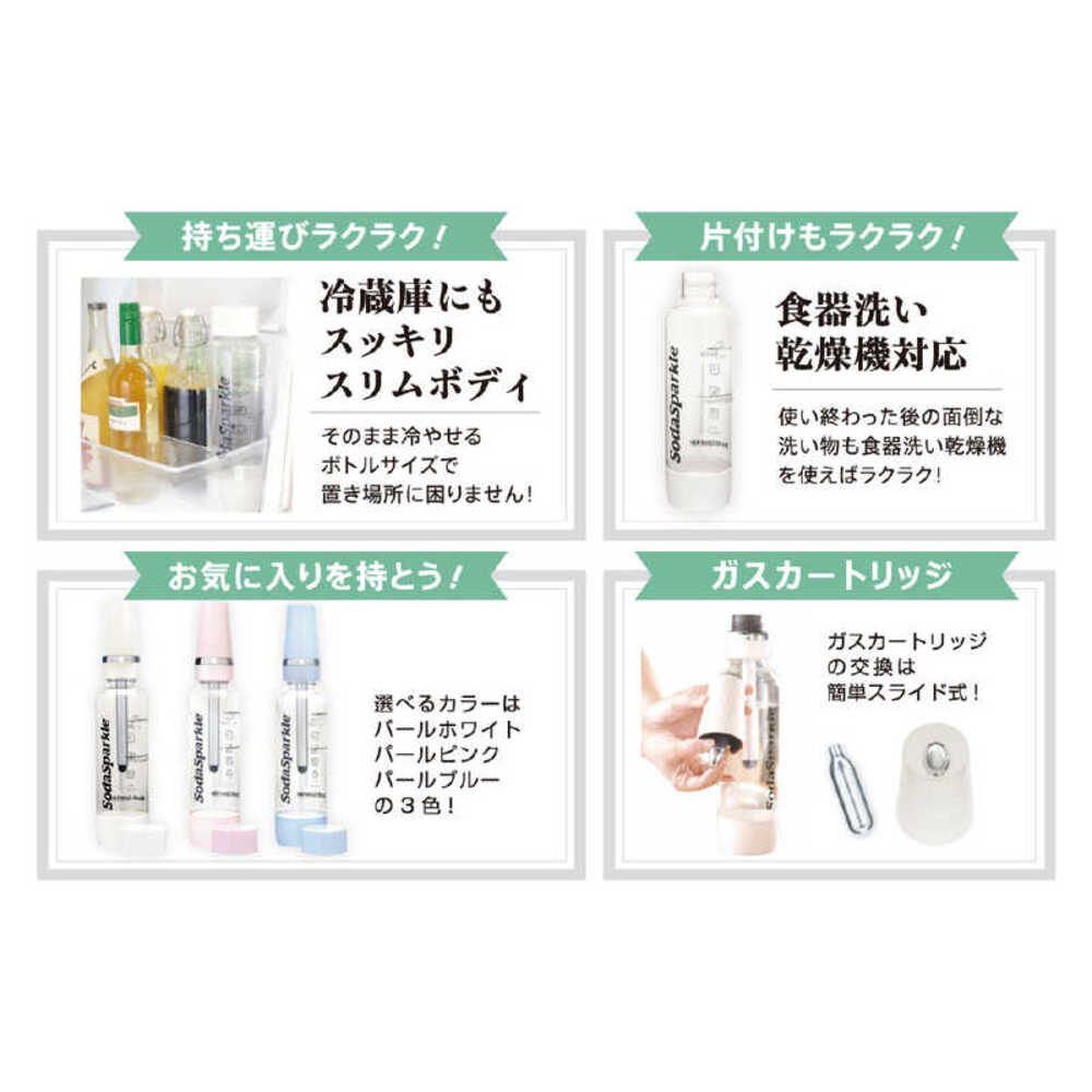 ●ボトル素材は、耐熱性・強度に優れたトライタンを使用。ボトルは、食洗機(低温モード)対応、熱湯消毒可能。 ●誰でも簡単に3ステップで簡単に炭酸水が作れます ●電源不要で持ち運べるので、普段使いはもちろんですがピクニック・グランピングなどでも大活躍します。 ●専用ガスカートリッジ1本で、水(1?)ジュースや白ワイン(650ml)炭酸水が作れます。 ●炭酸水を料理にも使えるレシピブック付き ●専用ガスカートリッジは、使用後そのまま不燃用ゴミで処分可能です。 ●購入してすぐ使えるレシピブック・ガスカートリッジ5本付属