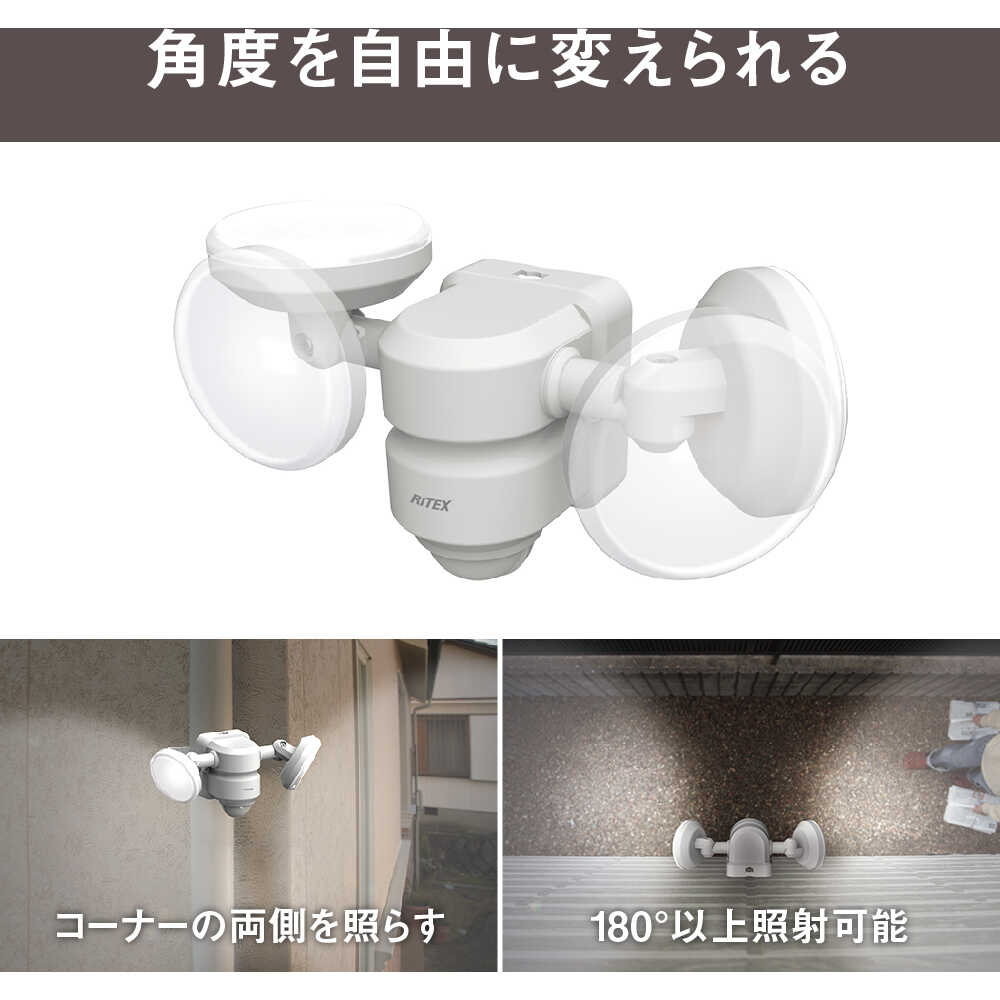 ●探知センサーで自動点灯、消灯します。●コンパクトなボディながら900ルーメンの明るさです。●広範囲を照らせる2灯式です。●ライトの方向が自由自在に動き、明かりがほしい狭い通路やコーナーの両側も照らせます。●幅(mm):188●奥行(mm):80●高さ(mm):107●光源色:白●使用電球(W):5W×2●消費電流(W):11●電源:AC100V●点灯保持時間:30秒●明るさ(lm):900●電源(V):AC100V●本体サイズ:高さ107mm 幅188mm 奥行き80●電源:AC100V電源(コード長:1.5m)●消費電:約11W(待機時:1.0W以下)●電球:5W×2 高輝度LED (設計寿命4万時間)●全光束:約900ルーメン●センサー機能(m):探知角度 水平約140° 探知距離(最大)約6●点灯時間:約30秒(固定)●点灯機能:周囲が暗い時のみ点灯 質量380g