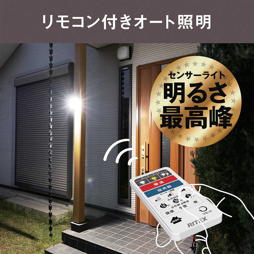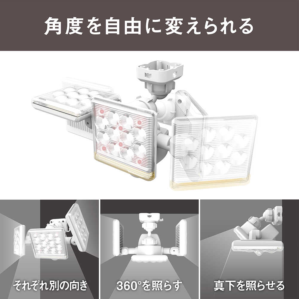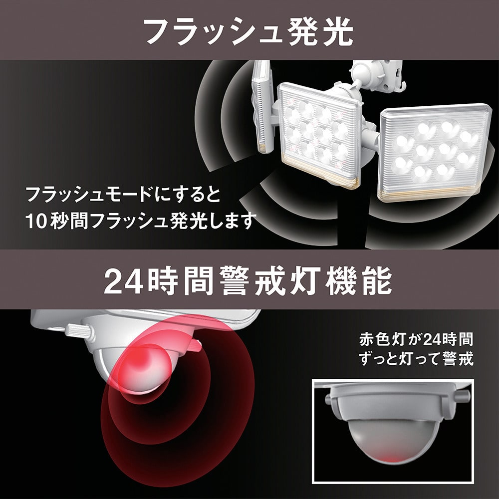 ●様々な設定をリモコンで遠隔操作できるセンサーライト(明るい白色灯、やさしい暖色灯、フラッシュ点滅+ブザー、投光器、常夜灯モード)です。●様々な設定をリモコンで遠隔操作できるセンサーライト(明るい白色灯、やさしい暖色灯、フラッシュ点滅+ブザー、投光器、常夜灯モード)取り付け可能です。●照射角度も自由自在です。●幅(mm):325●奥行(mm):141●高さ(mm):127●光源色:白色・電球色●使用電球(W):12×3灯●消費電流(W):点灯時:37W(全灯)、25W(暖色灯)、2.2W(常夜灯)/待機時:1W以下●電源:AC100V●点灯保持時間:10秒/30秒/5分/10秒フラッシュ●明るさ(lm):3200●明るさ:3200●電源(V):AC100V●保護等級:IP44●明るさ:3200lm●探知距離:12m●探知範囲:180° 質量1110g
