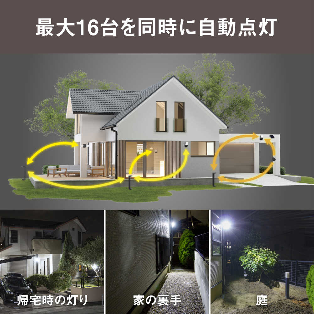 ●無線連動で一斉点灯します。●1か所のセンサーが感知すると設置しているライト複数台を一斉に点灯させることができます。●一斉点灯による威嚇効果と死角がなくなることで防犯効果を高めます。●ワイヤレスの連動設定は簡単シンプルです。●連動したい製品の4つのスイッチを同じ形に合わせるだけです。●設置しているすべてのワイヤレス製品を同じ形にすればすべての製品が一斉点灯します。●スイッチの形を分けることで連動グループを区別することも可能です。(最大16台16チャンネル)●幅(mm):85●奥行(mm):150●高さ(mm):156●光源色:白●使用電球(W):7●電球:7W×1 (高輝度白色LED設計寿命4万時間)●全光束:600ルーメン / 常夜灯 約30ルーメン●電源/電圧:AC100V/50Hz/60Hz●消費電力:点灯時:8W(点灯時) / 1W (常夜灯) / 待機時:0.5W以下●センサー探知方式:焦電型赤外線センサー●探知範囲:最大180° 最遠8m 取り付け高さ2.5m 質量620g