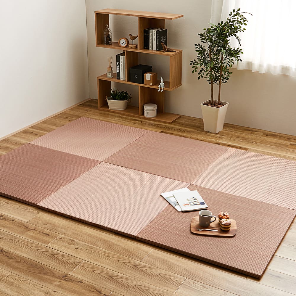 洋室・和室を問わず使えるカラフルで可愛い縁なしの置き畳。1枚が約1.0kgの軽量タイプなので、女性の方でも持ち上げや移動がしやすく、簡単に空間作りをお楽しみいただけます。ふんわり柔らかな使い心地。厚さ約2.5cmと十分な厚みで防音・クッション性も◎裏面には滑りにくい加工を付けているから、安心してお使いいただけます。