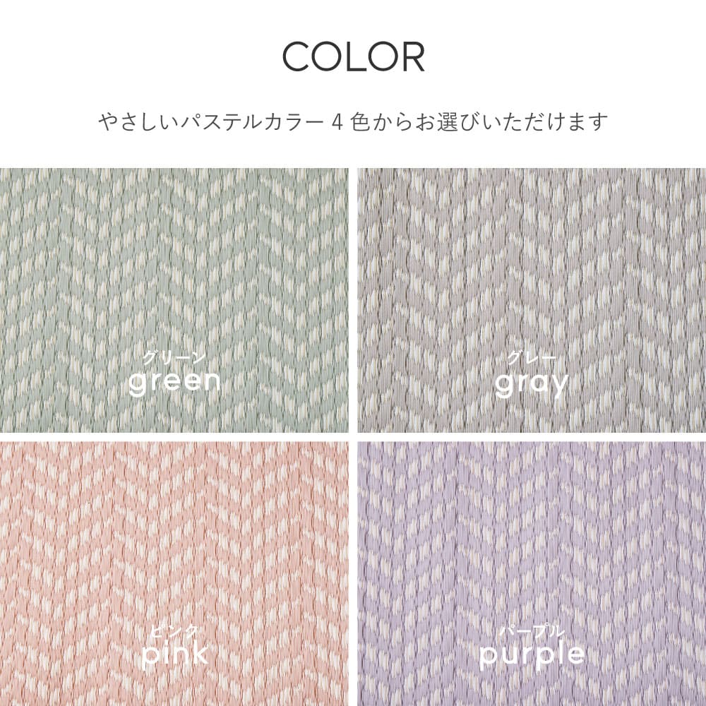 パステルカラーがかわいい、水拭きできる素材のい草風カーペット。パイプの表面に筋が入っている筋入りパイプで、肌に密着しないからベタベタしにくく、汗ばむ季節にもおすすめ。また、パイプ内の空気層の保温効果で床からの冷気を防ぐため、寒い季節でもあたたかく過ごせます。