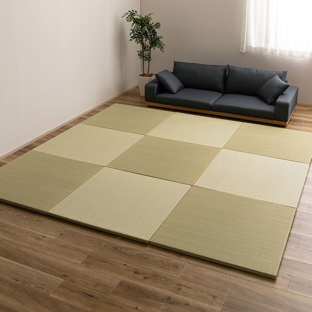天然い草×樹脂素材。調湿効果や抗菌性など、天然い草の自然の機能や風合いはそのままに、丈夫な樹脂パイプを織り交ぜることで耐久性をアップ!異なる素材のいい性質を残したハイブリッド置き畳。樹脂パイプは傷つきにくく、日焼けなどによる色褪せにつよいため色合いや風合いを長く保ち、耐久性が上がることでより長くお使いいただけます。場所や広さはお好みで、置くだけでかんたんに畳スペースがつくれる置き畳は、ちょっとした隙間スペースを有効活用できるので、キッズ向けのプレイマットからシニアのお昼寝、お父さんお母さんのごろ寝スペースまで使い方はいろいろ。軽量だから設置はもちろん、掃除やなどの移動もらくらく。適度なクッション性があり、階下への配慮や床のキズ防止など、子育て中にもうれしい便利グッズ。