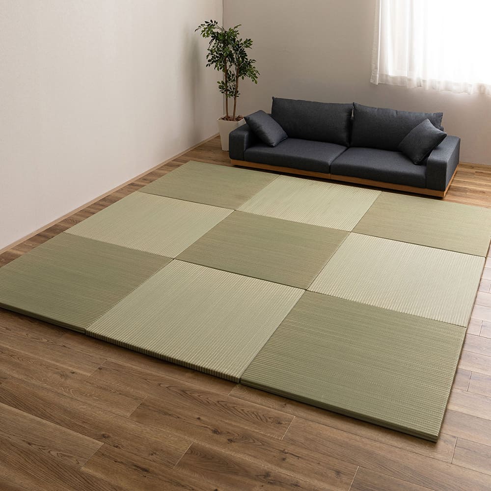 天然い草×樹脂素材。調湿効果や抗菌性など、天然い草の自然の機能や風合いはそのままに、丈夫な樹脂パイプを織り交ぜることで耐久性をアップ!異なる素材のいい性質を残したハイブリッド置き畳。樹脂パイプは傷つきにくく、日焼けなどによる色褪せにつよいため色合いや風合いを長く保ち、耐久性が上がることでより長くお使いいただけます。場所や広さはお好みで、置くだけでかんたんに畳スペースがつくれる置き畳は、ちょっとした隙間スペースを有効活用できるので、キッズ向けのプレイマットからシニアのお昼寝、お父さんお母さんのごろ寝スペースまで使い方はいろいろ。軽量だから設置はもちろん、掃除やなどの移動もらくらく。適度なクッション性があり、階下への配慮や床のキズ防止など、子育て中にもうれしい便利グッズ。
