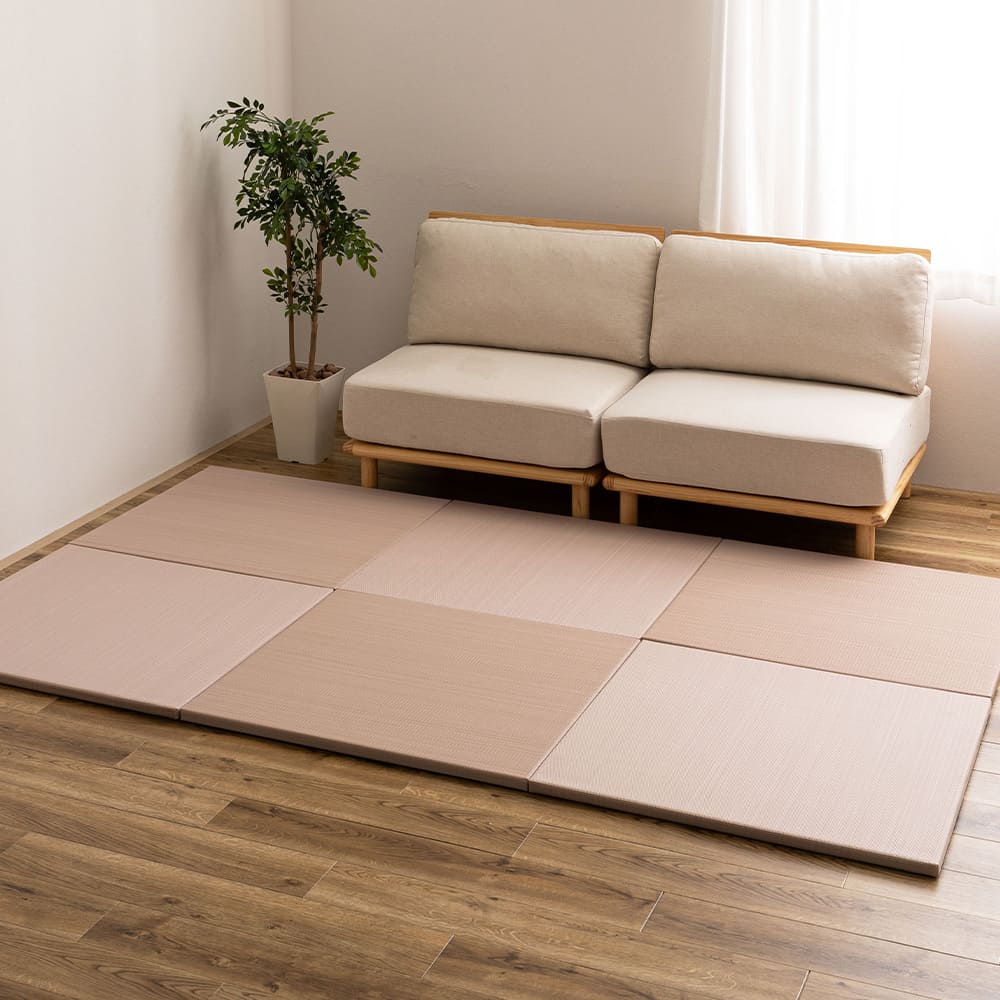 パイプ状にした樹脂素材を、い草と同じように織り上げた『い草風』の置き畳。水に強く、ジュースなどをこぼしてもさっと拭き取れるから汚れても安心。子どもやペットのいるご家庭におすすめです。ちょっとした隙間スペースを有効活用できるのでキッズ向けのプレイマットからシニアのお昼寝、お父さんお母さんのごろ寝スペースまで使い方はいろいろ。置くだけでかんたんに畳スペースが作れます。軽量だから設置はもちろん、掃除やなどの移動もらくらく。適度なクッション性があり、階下への配慮や床のキズ防止など、子育て中にもうれしい便利グッズ。淡くやさしいパステルカラーで、お部屋の雰囲気にあわせて5色からお選びいただけます。