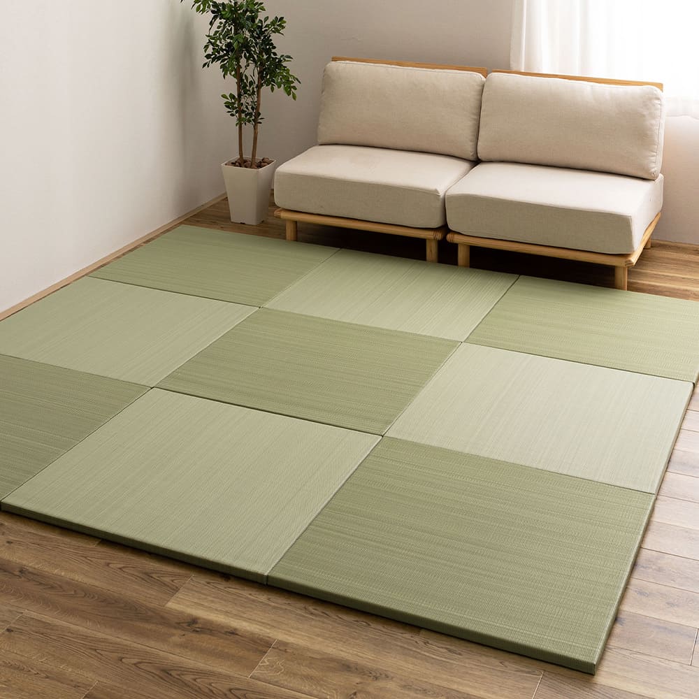 パイプ状にした樹脂素材を、い草と同じように織り上げた『い草風』の置き畳。水に強く、ジュースなどをこぼしてもさっと拭き取れるから汚れても安心。子どもやペットのいるご家庭におすすめです。ちょっとした隙間スペースを有効活用できるのでキッズ向けのプレイマットからシニアのお昼寝、お父さんお母さんのごろ寝スペースまで使い方はいろいろ。置くだけでかんたんに畳スペースが作れます。軽量だから設置はもちろん、掃除やなどの移動もらくらく。適度なクッション性があり、階下への配慮や床のキズ防止など、子育て中にもうれしい便利グッズ。淡くやさしいパステルカラーで、お部屋の雰囲気にあわせて5色からお選びいただけます。