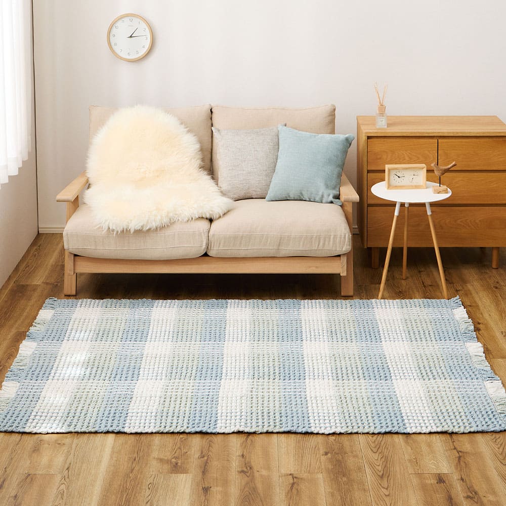 やわらかい糸を立体的に織り込んだワッフル風のぽこぽこ触感。コットンのサラッとしたタッチと、ポリエステルの乾きやすさ、ふたつの素材の特徴を活かした使いやすいラグマットです。汚れたら洗濯機で洗えるのも嬉しいポイント。さわやかなギンガムチェックのデザインで、インテリアのアクセントにぴったりなアイテムです。