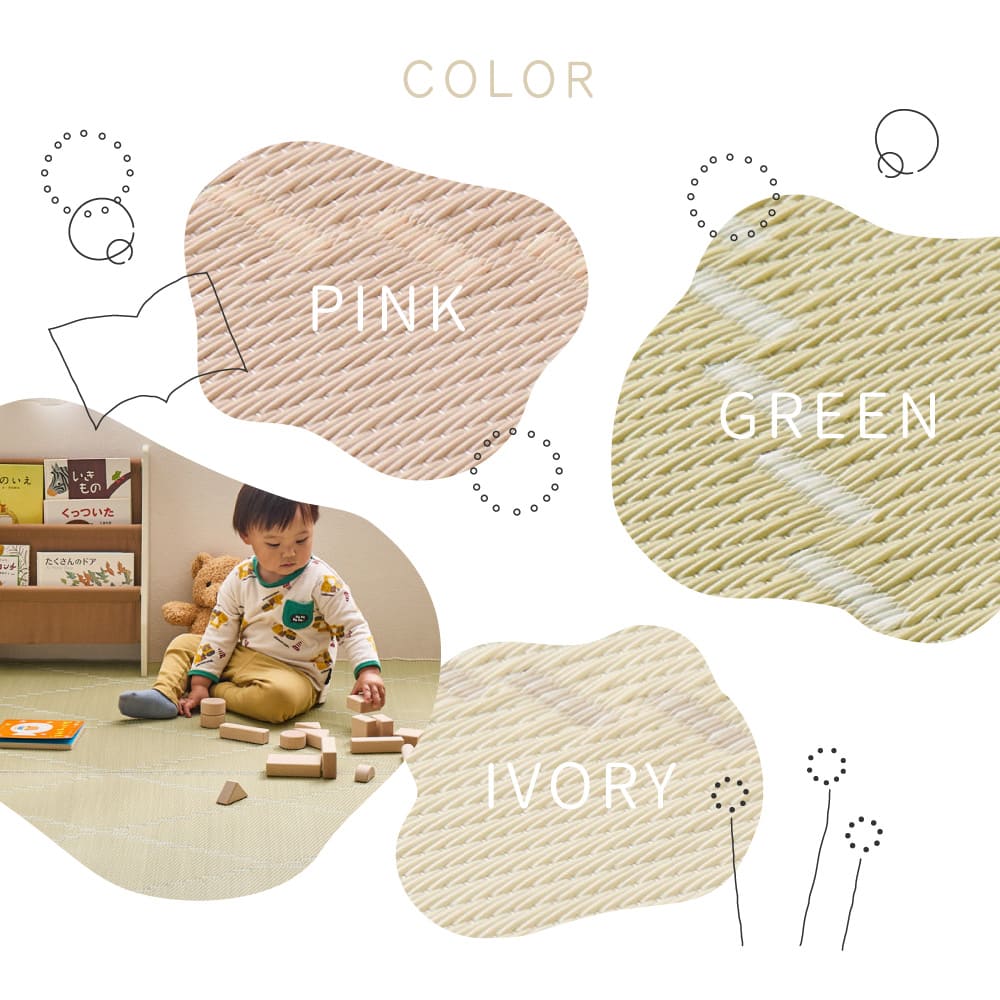 パステルカラーがかわいい、水に強い素材でできたい草風カーペット。地味な雰囲気になりがちな和室も明るくかわいいお部屋にイメージチェンジできます。傷んでしまった畳のカバーや、新しい畳の日焼けやキズの防止にも。パイプの表面に筋が入っている筋入りパイプで、肌に密着しないからベタベタしにくく、汗ばむ季節にもおすすめ。また、パイプ内の空気層の保温効果で床からの冷気を防ぐため、寒い季節でもあたたかく過ごせます。