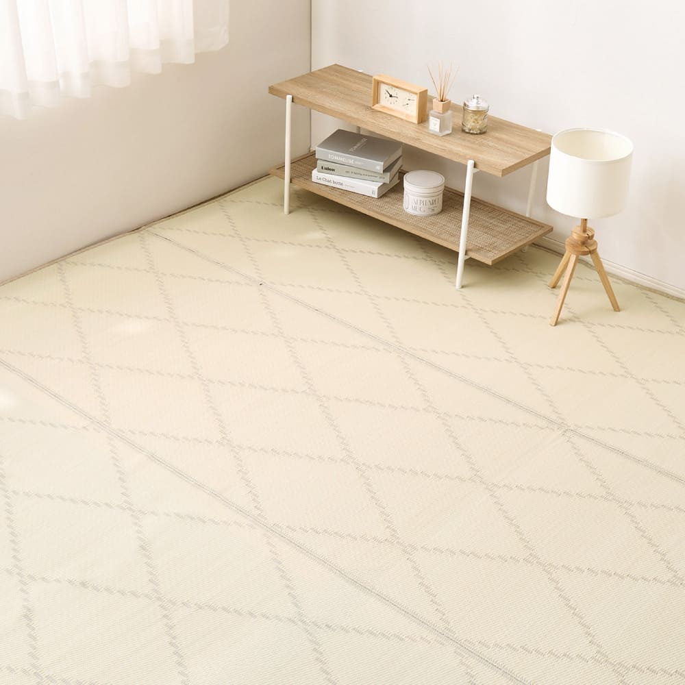 パステルカラーがかわいい、水に強い素材でできたい草風カーペット。地味な雰囲気になりがちな和室も明るくかわいいお部屋にイメージチェンジできます。傷んでしまった畳のカバーや、新しい畳の日焼けやキズの防止にも。パイプの表面に筋が入っている筋入りパイプで、肌に密着しないからベタベタしにくく、汗ばむ季節にもおすすめ。また、パイプ内の空気層の保温効果で床からの冷気を防ぐため、寒い季節でもあたたかく過ごせます。