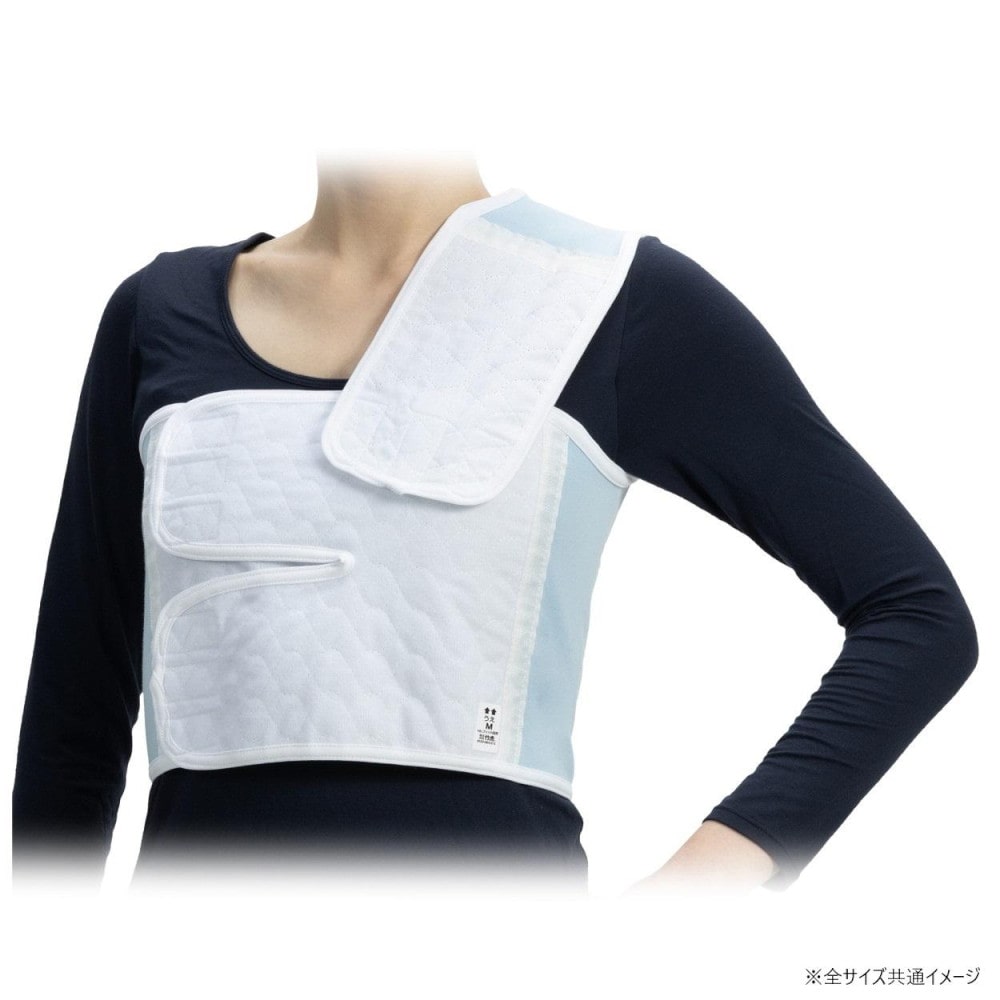 手術後の患部をやさしく保護し、ズレずにしっかり固定する。2つに分かれた留め部で調整でき、肩バンドも付いてズレにくくなっています。伸縮素材で体にフィットし、厚手生地でしっかり固定してくれるので安心です。綿が主体のソフトな肌ざわりで、やさしく保護します。