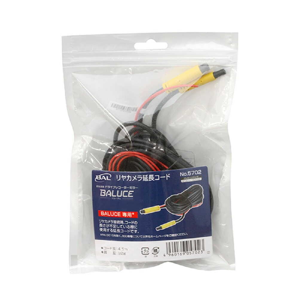 大橋産業BALUCE専用※No.5610を除く リヤカメラ接続時、コードの長さが不足している際に使用する延長コードです。 最大2本まで接続可能 合計16m(リヤカメラ接続コード:7m+本品:4.5m×2本)