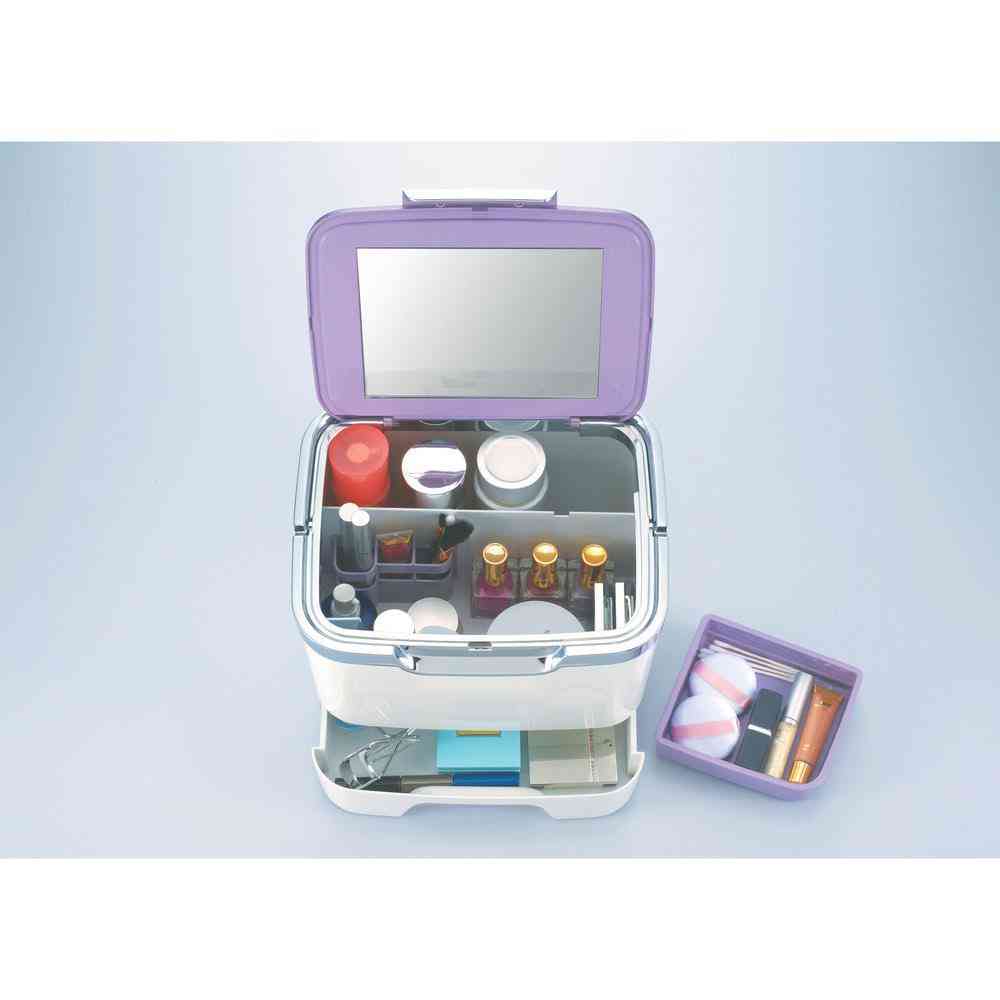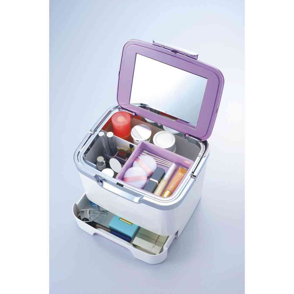 化粧水からメイク小物までのコスメ用品をすっきり収納できる、うれしいコスメボックス。 スキンケアからメイクに必要なものがまるっと入る大容量のコスメボックスです。 飾り枠と持ち手部分にシルバーをあしらった高級感のあるデザイン。 フタについているワイドな鏡が使いやすいので鏡がない場所でもメイクができます。 ●取り外しの出来る小物トレーには綿棒やコットン、パフなどメイク小物を。 ●便利な小物立て付きにはメイクブラシ、マスカラ、アイライナー、アイブロウなどを立てて収納できます。 ●ワイドな引き出しにはビューラーやファンデーション、アイシャドウのようなコンパクト類を収納できます。