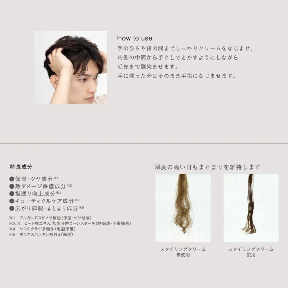 ソフトなセット力で質のいい素髪感を表現 雨の日でもまとまりやすい耐湿処方 ソフトなセット力で抜け感や、やわらかい質感を表現するスタイリングクリーム。 雨の日も一日中広がらない耐湿処方。 ハンドケアやボディケアにも。 保湿・ツヤ成分 (アルガニアスピノサ核油) 熱ダメージ保護成分(ビート根エキス、加水分解コーンスターチ) 指通り向上成分(ビート根エキス、加水分解コーンスターチ) キューティクルケア成分(シロキクラゲ多糖体) 広がり抑制・まとまり成分(ポリアスパラギン酸Na) セット力:1 重さ・しっとり:4 ツヤ:4 やわらかさ:3 ※5段階評価 (使用方法)手のひらや指の間までしっかりクリームをなじませ、内側の中間から手ぐしでとかすようにしながら毛先まで馴染ませます。手に残った分はそのまま手指になじませます。