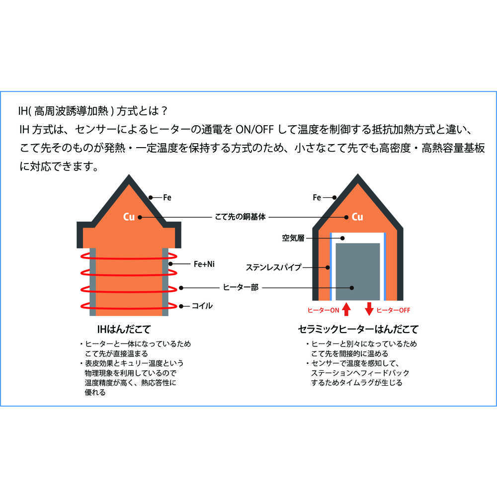 ●マイクロソルダリング(微細はんだ付け)に最適です。●次世代のIH(高周波誘導加熱)方式を採用しています。●顕微鏡下でも機敏に操作できるよう、軽量で細身のグリップと細く軽いコードを採用しています。●電源(V):AC100●消費電力(W):28~85●設定温度(度):350・400・450●幅(mm):127●奥行(mm):167●高さ(mm):150●コテ部コード長さ(m):1.3●電源コード長さ(m):1.5●コテ部コード長さ:1.3m●電源コード長さ:1.5m 質量3kg