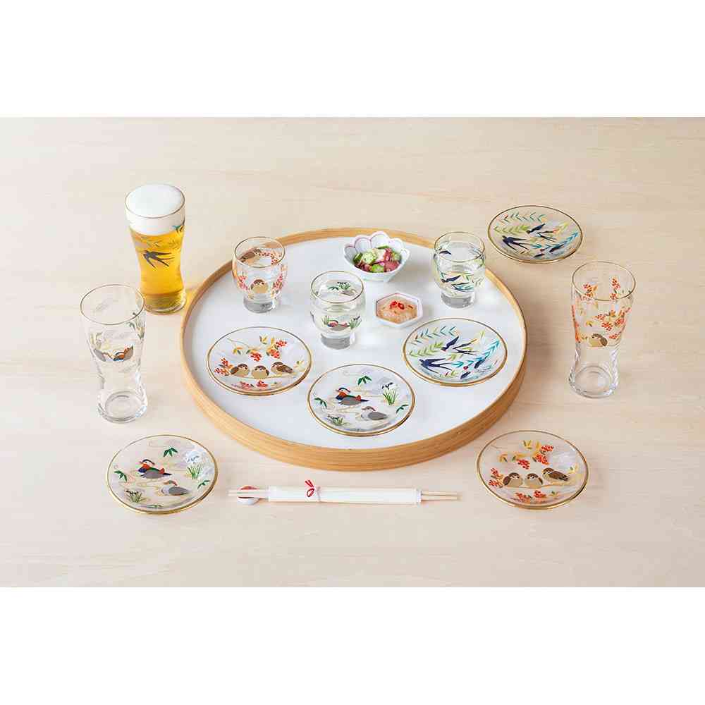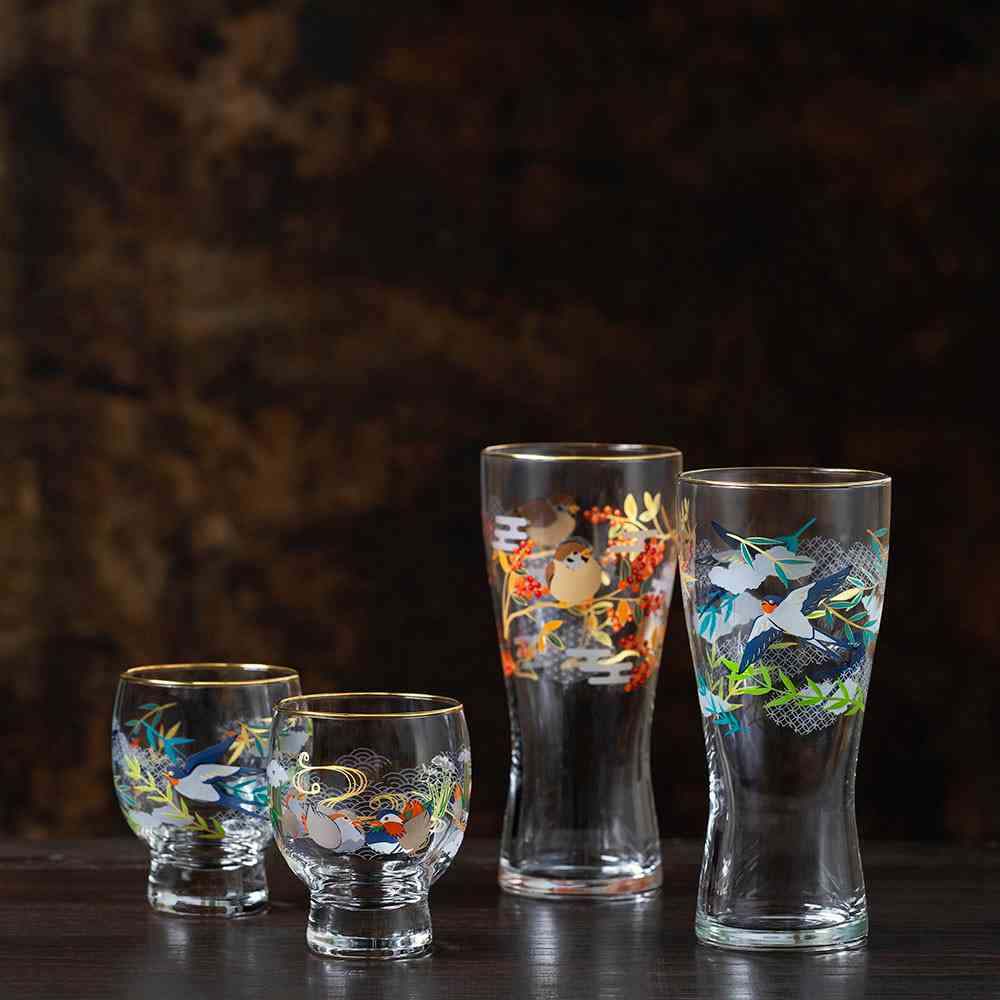 美しい花や鳥などを主に描いた絵画は『花鳥画』と呼ばれ、その芸術性や縁起の良さから親しまれ、贈答品としても使われた歴史があります。『吉祥花鳥』はそんな花鳥画にインスピレーションを受け、美しい花と鳥・吉祥文様を施したグラスです。 それぞれの柄には特別な意味合いが込められています。大切な人への贈り物や、豊かなひと時を過ごすのにぴったりなグラスウェアです。 【鴛鴦と菖蒲】魔除けの意味を持つ菖蒲と、青海波に囲まれて仲良く寄り添う鴛鴦夫婦。未来永劫幸せが続く願いを込めました。 色落ちすることがありますので食器洗い乾燥機でのご使用はお避けください。洗浄の際は優しく手洗いをおすすめします。