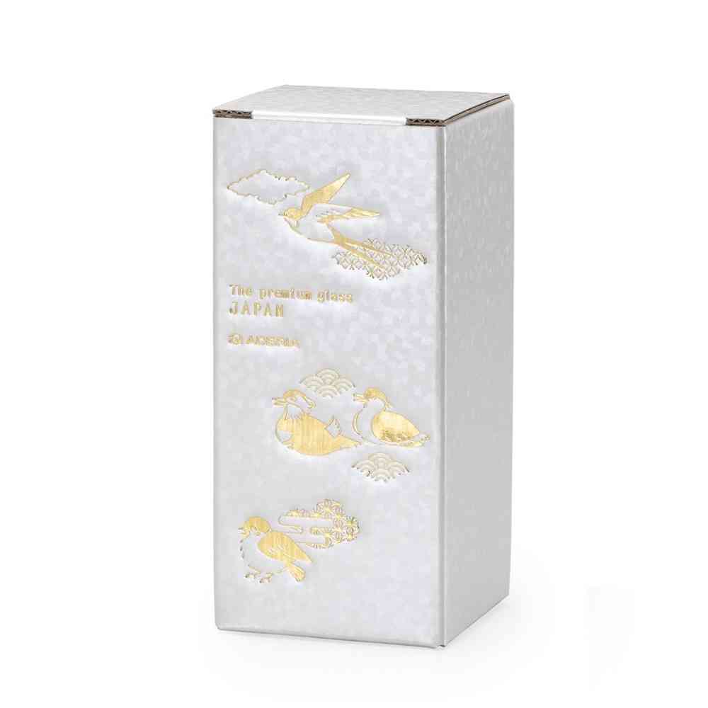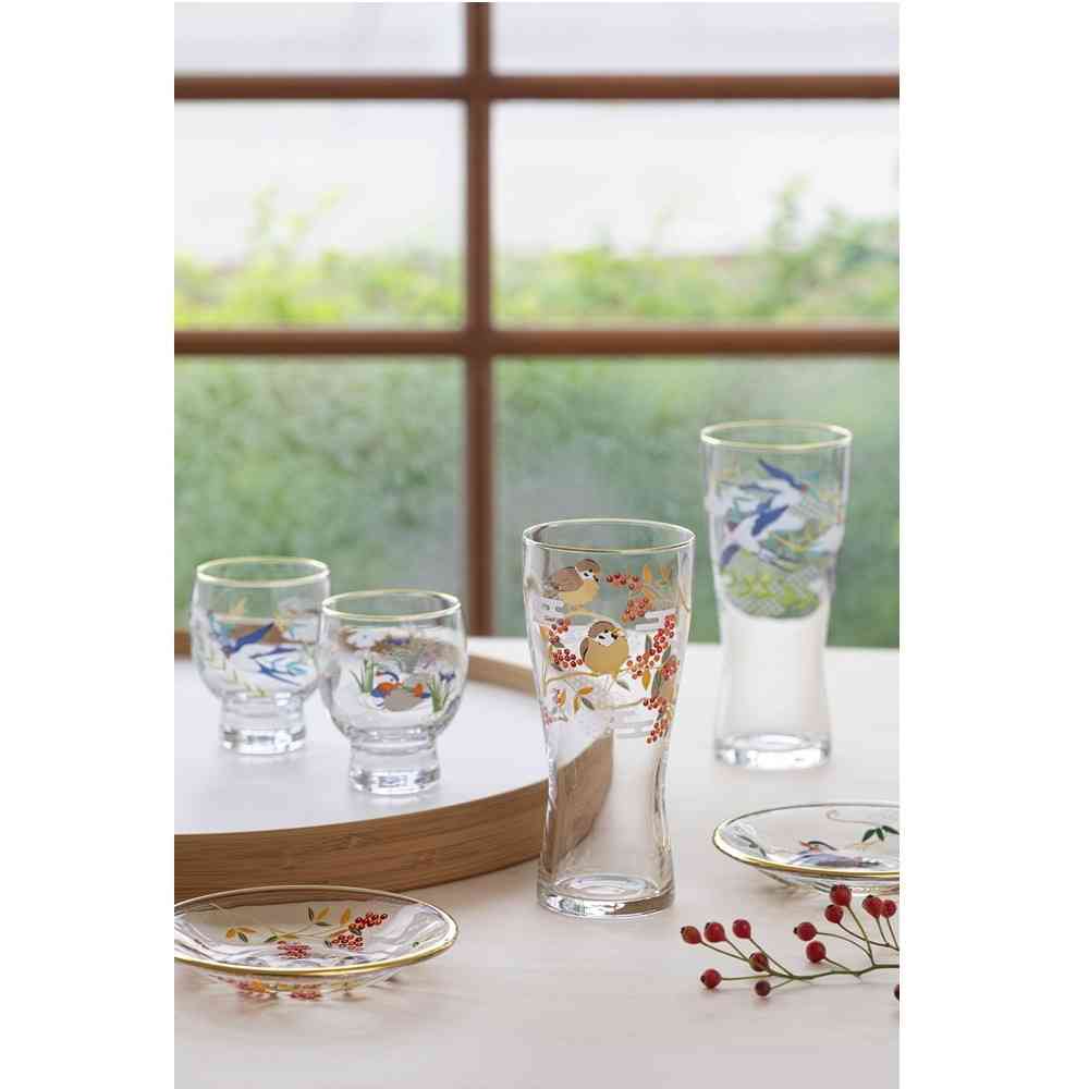 美しい花や鳥などを主に描いた絵画は『花鳥画』と呼ばれ、その芸術性や縁起の良さから親しまれ、贈答品としても使われた歴史があります。『吉祥花鳥』はそんな花鳥画にインスピレーションを受け、美しい花と鳥・吉祥文様を施したグラスです。 それぞれの柄には特別な意味合いが込められています。大切な人への贈り物や、豊かなひと時を過ごすのにぴったりなグラスウェアです。 【雀と南天】南天をついばむスズメは、難を転じて家内安全をもたらすといわれています。子供の成長や魔除けの願いを込めて麻の葉紋様を組み合わせました。 色落ちすることがありますので食器洗い乾燥機でのご使用はお避けください。洗浄の際は優しく手洗いをおすすめします。