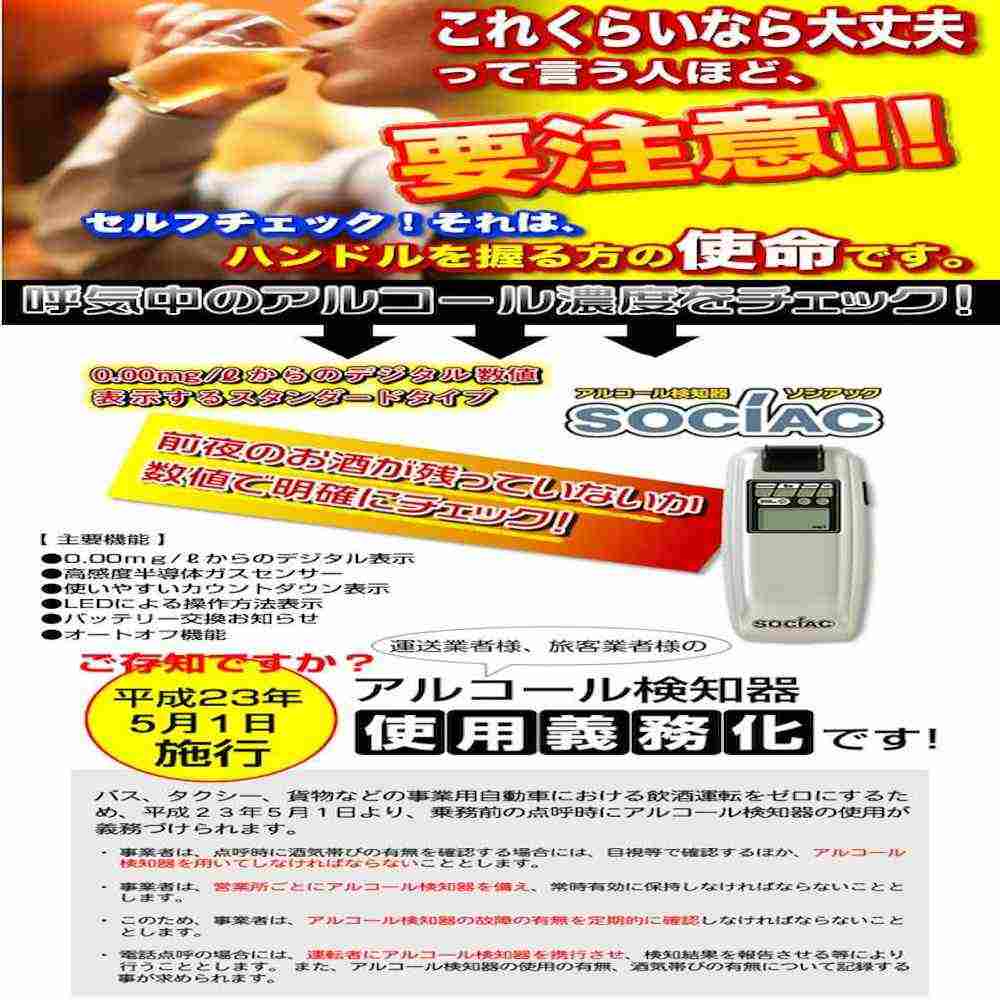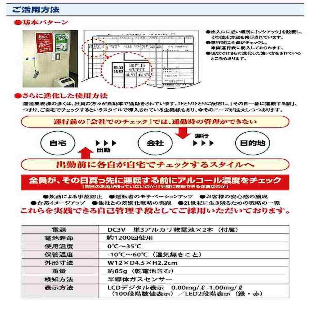 飲んだ後は、アルコール濃度をセルフチェック!平成23年5月1日より、運送業者様・旅客業者様のアルコールチェッカーの使用が義務化されます。前夜のお酒が残っていないかしっかりセルフチェックして安全運転を心がけましょう。 飲酒/チェック/調べる/測定/計測器/簡単/正確/小さい/コンパクト/デジタル
