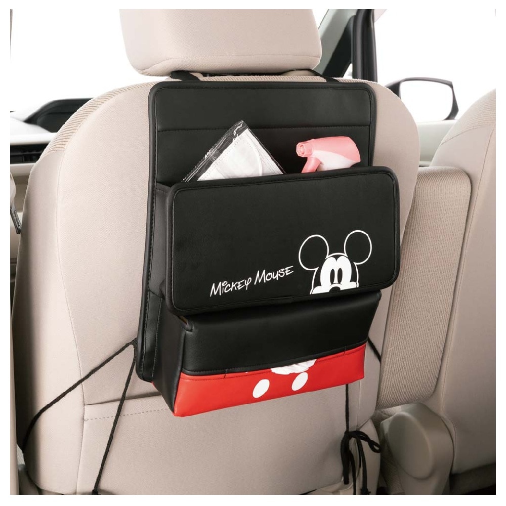 ひょっこり顔を出すミッキーのアートがかわいいシートバックポケット 上部のポケットにはB5サイズの雑誌やノート、10インチまでのタブレット、お菓子など、下段には箱厚6cmまでのボックスティッシュが入ります。 取付の際はベルト部をヘッドレストにかけ、下部をヒモで固定するだけなのでとっても簡単です。