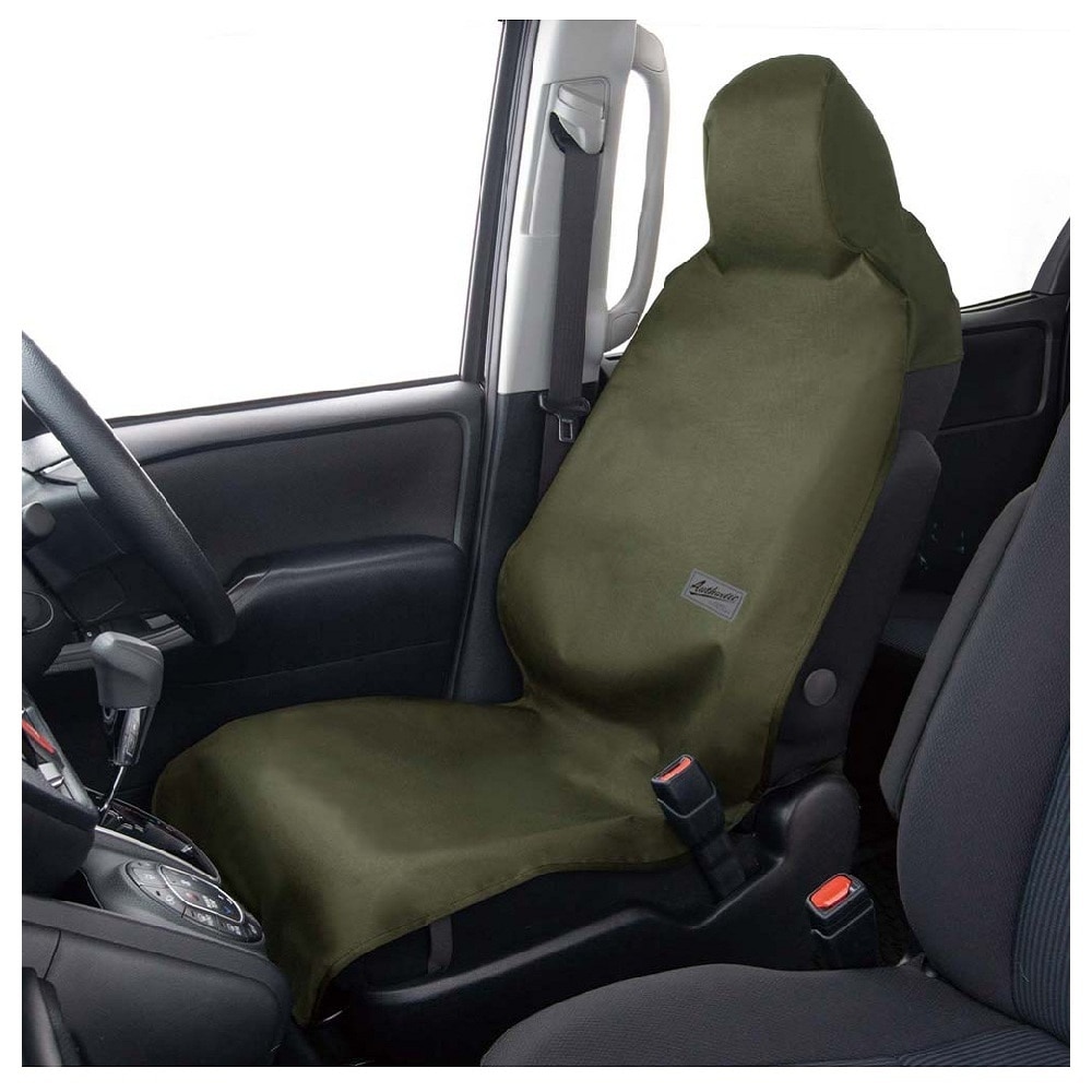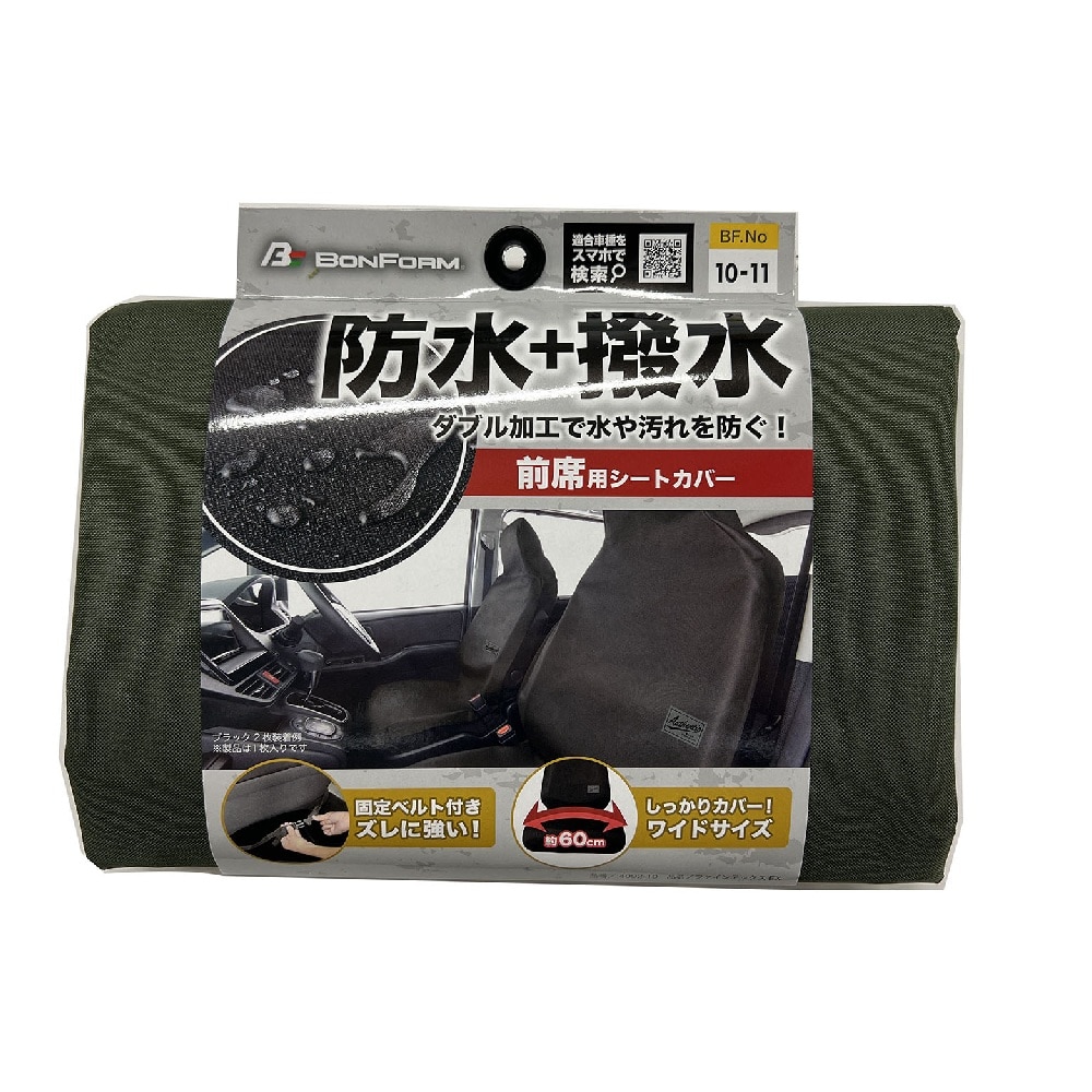 防水+撥水のダブル効果で水や汚れを防ぐ前席用シートカバー シート表面をしっかりカバーする幅60cmワイドタイプで、車種を選ばず取付簡単。腰部についたバックルタイプの固定ベルトがカバーのズレを防ぎます。 背裏は半分だけ隠れるハーフタイプなのでサイドエアバッグ装備車にも対応しています。
