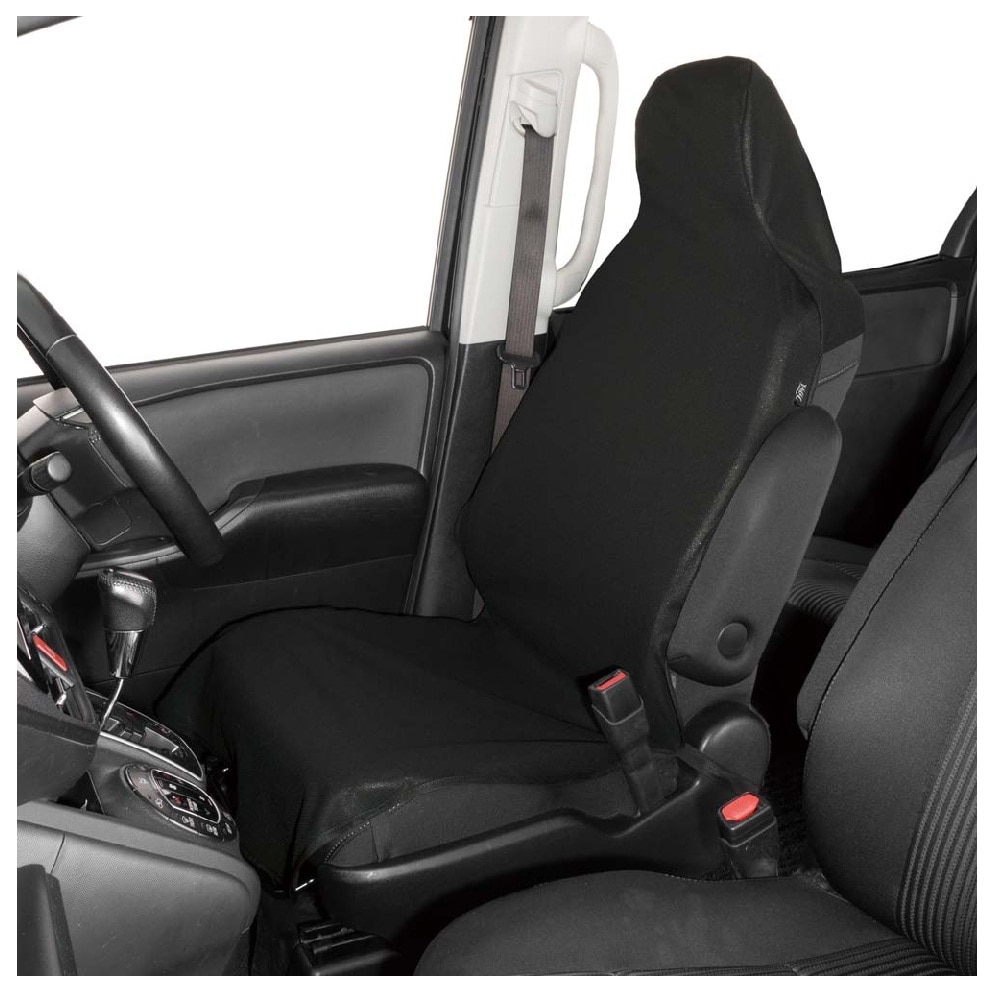 汗・細菌の気になるニオイを防ぐ前席用のシートカバーはファブリーズとコラボレーションシリーズ 繊維上で細菌の増殖を抑える抗菌防臭加工と汗臭の原因菌の増殖を抑える消臭加工した生地に防水加工を施して表地に採用しました。カバーには乗降時のズレを防止するバックルタイプの固定ベルト付き。軽自動車から普通車までほとんどのシートに対応。サイドエアバッグにも対応しているので、幅広い車種に取り付け可能です。