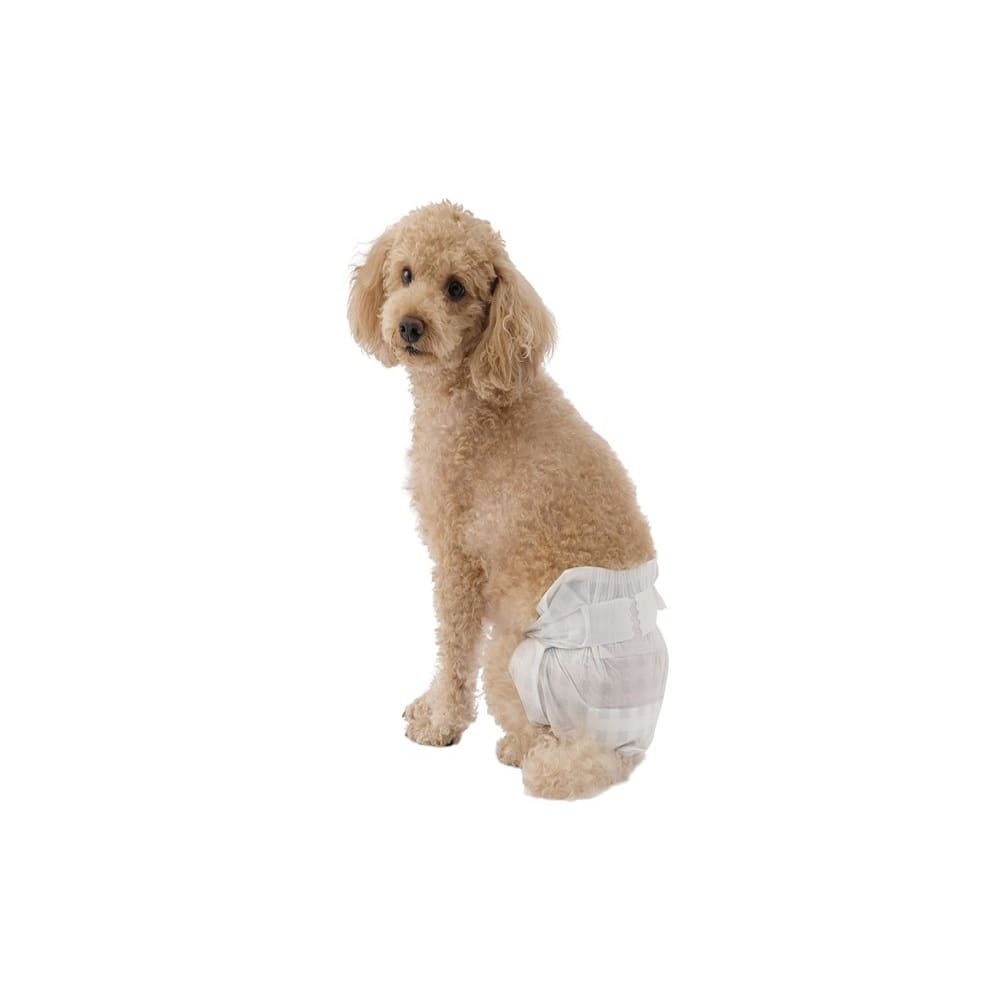 安心設計、らくらく装着で脱げにくいパンツタイプのペット用おむつです。生理・介護・おでかけなどに使用できます。ペットの体型にフィットするおむつです。2つのテープで留めるだけで簡単に装着できます。ウエストのギャザーでズレにくく、脱げにくいおむつです。また、サイドのギャザーでおしっこや、やわらかいウンチをせき止めます。抗菌・高吸収ポリマーの効果で、水分をゼリー状に固定化するので逆戻りせず清潔です。