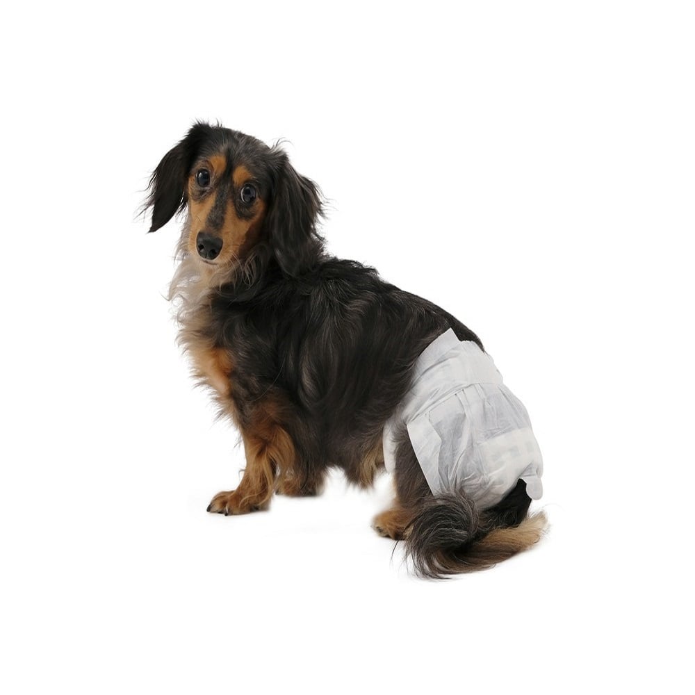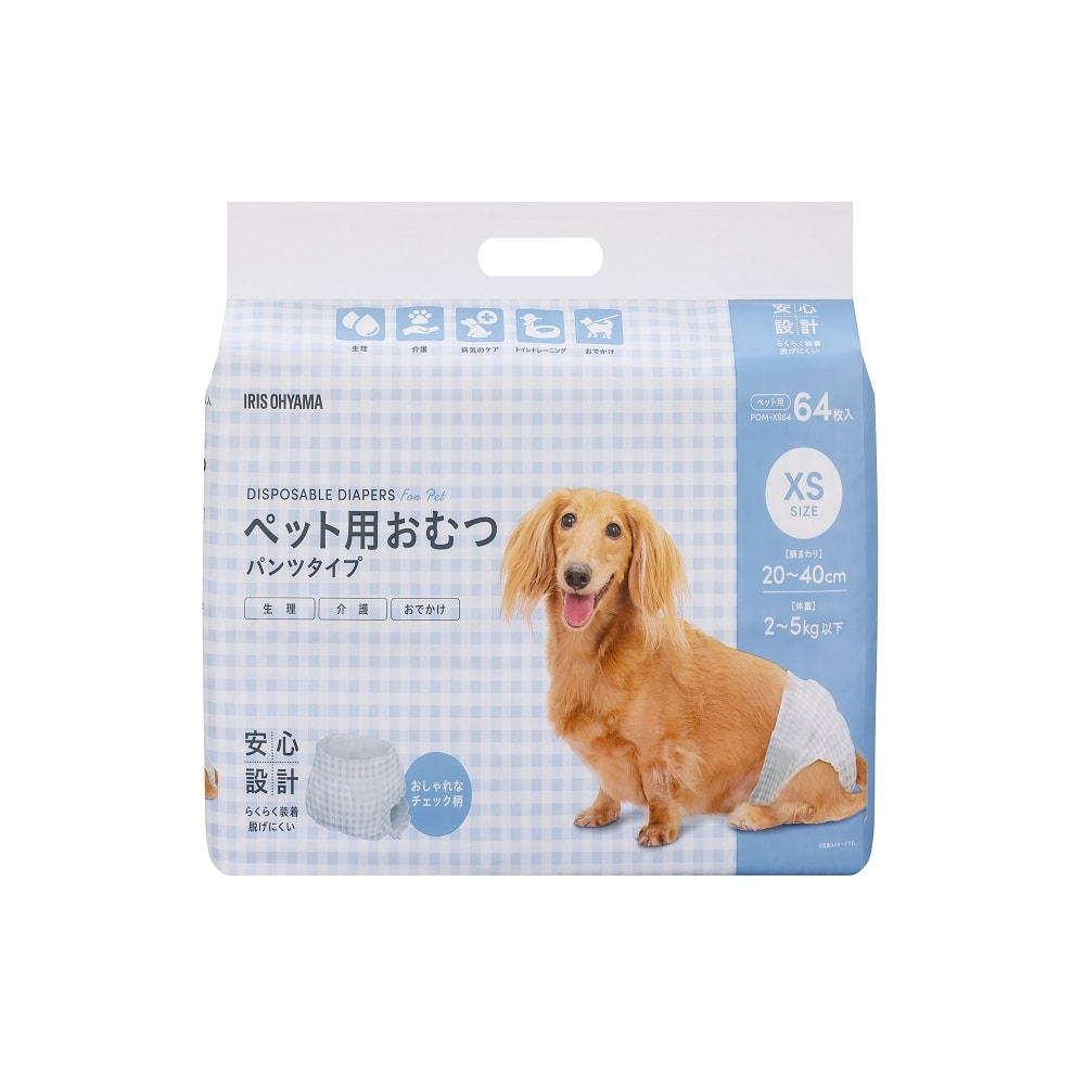 安心設計、らくらく装着で脱げにくいパンツタイプのペット用おむつです。生理・介護・おでかけなどに使用できます。ペットの体型にフィットするおむつです。2つのテープで留めるだけで簡単に装着できます。ウエストのギャザーでズレにくく、脱げにくいおむつです。また、サイドのギャザーでおしっこや、やわらかいウンチをせき止めます。抗菌・高吸収ポリマーの効果で、水分をゼリー状に固定化するので逆戻りせず清潔です。