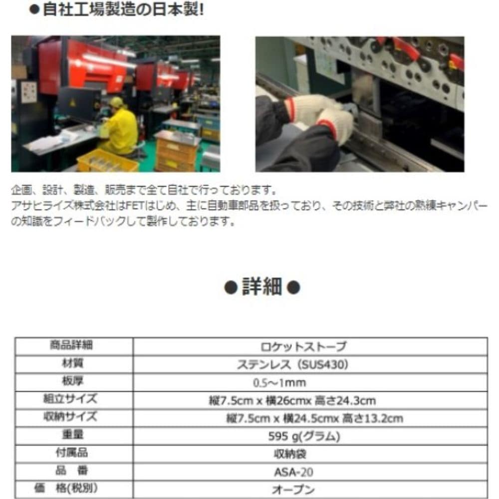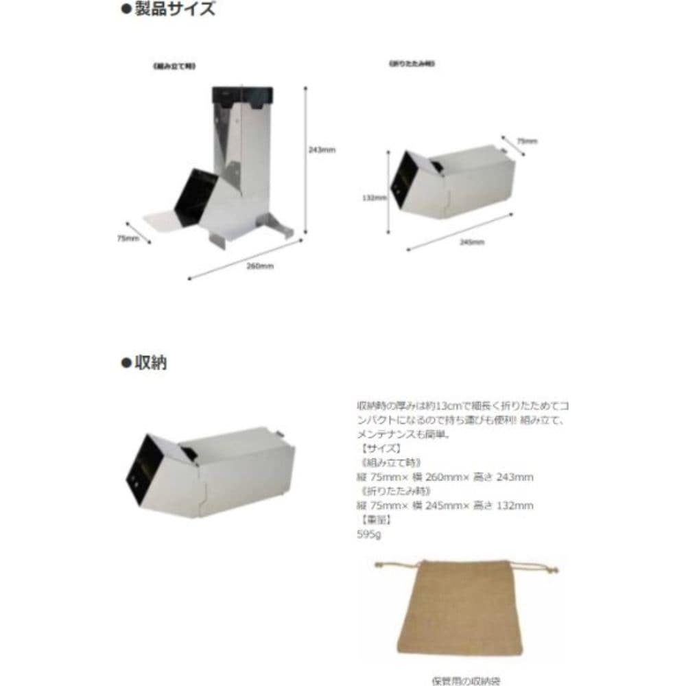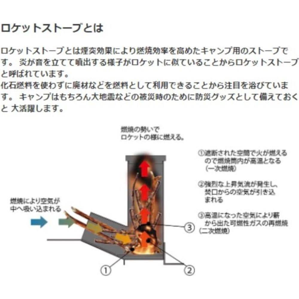 煙突効果で大火力!暖も取れて調理も出来る!ソロキャンプ、非常用の防災グッズとしてもオススメです!!●ロケットストーブとは煙突効果により燃焼効率を高めたキャンプ用のストーブです。●炎が音を立てて噴出する様子がロケットに似ていることからロケットストーブと呼ばれています。●化石燃料を使わずに廃材などを燃料として利用できることから注目を浴びています。●煙突上部の五徳に、やかんや鍋、鉄板などを置いて簡単に調理が出来ます。●組立サイズ:縦7.5cm x 横26cm x 高さ24.3cm●収納サイズ:縦7.5cm x 横24.5cm x 高さ13.2cm●重量:約595g