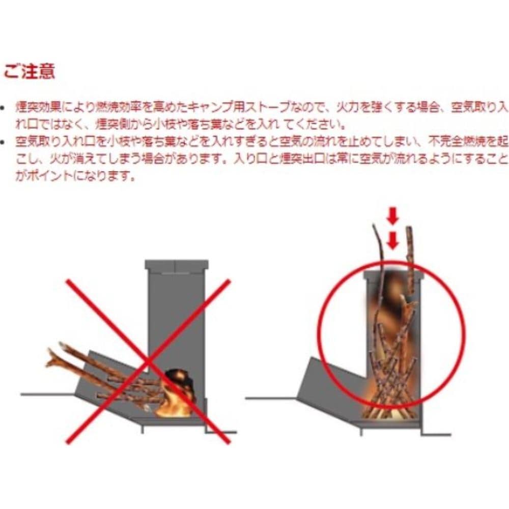 ●煙突効果により燃焼効率を高めたキャンプ用ストーブなので、火力を強くする場合、空気取り入れ口ではなく、煙突側から小枝や落ち葉などを入れ てください。●空気取り入れ口を小枝や落ち葉などを入れすぎると空気の流れを止めてしまい、不完全燃焼を起こし、火が消えてしまう場合があります。