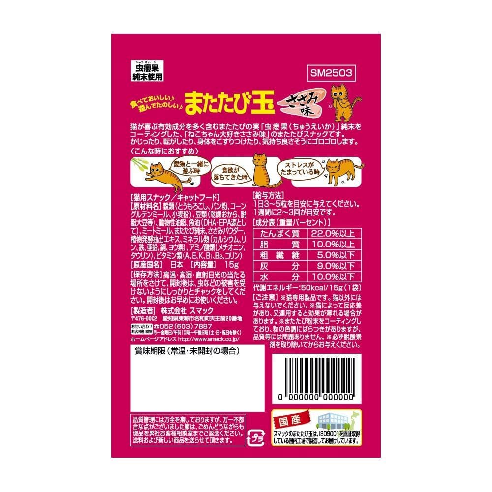 またたび純末をコーティングした「猫ちゃん大好きささみ味」のコミュニケーションスナック。少し大きめの粒で猫が遊んだり、食べたりします。食欲の落ちた猫、ストレスが溜まっている猫、オーナー様が一緒に遊びたい時などに。