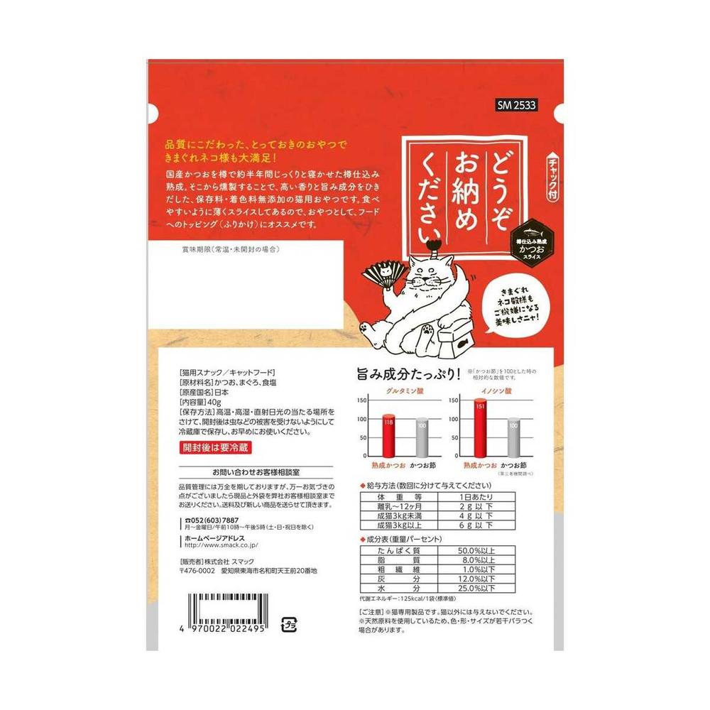 品質にこだわった節で、ネコ様のおやつタイムを「どうぞお納めください」 国産かつおを樽で約半年間じっくりと寝かせた樽仕込み熟成。 そこから燻製することで高い香りと旨み成分をひき出した、保存料・着色料無添加の猫用おやつです。 食べやすいように薄くスライスしてあるので、おやつとして、フードへのトッピング(ふりかけ)にオススメです。 便の状態、体調などを考慮して与えてください。