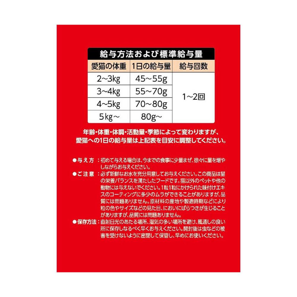 肉類(チキンミール、ミートミール、チキンレバーパウダー)、でん粉類(馬鈴薯でん粉、タピオカでん粉)、甘藷ミール、動物性油脂、魚介類(フィッシュエキス(DHA源として)、フィッシュパウダー)、酵母、セルロース粉末(食物繊維源として)、酵母細胞壁(オリゴ糖源として)、植物発酵抽出エキス、殺菌乳酸菌、納豆菌、ビタミン類(A、D、E、K、B1、B2、B6、ナイアシン、葉酸、コリン)、アミノ酸類(メチオニン、タウリン、トリプトファン)、ミネラル類(カリウム、鉄、亜鉛、銅、ヨウ素)、pH調整剤、酪酸菌 たんぱく質35.0%以上、脂質12.0%以上、粗繊維4.0%以下、灰分9.0%以下、水分10.0%以下、カルシウム1.0%以上、ナトリウム0.5%以上、リン0.8%以上、マグネシウム0.09%(標準分析値)