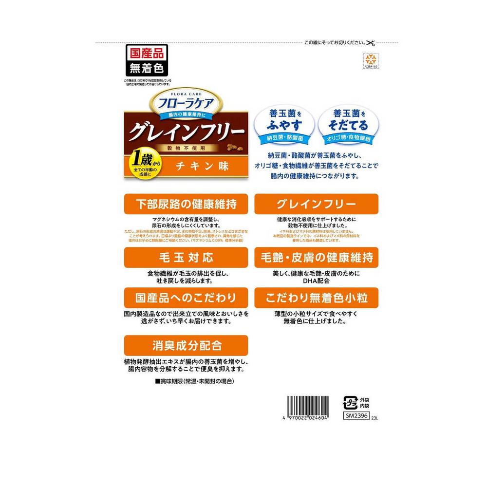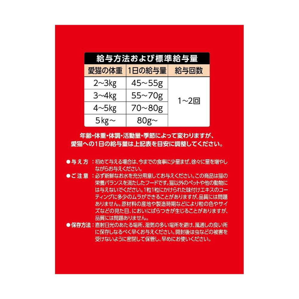 肉類(チキンミール、ミートミール、チキンレバーパウダー)、でん粉類(馬鈴薯でん粉、タピオカでん粉)、甘藷ミール、動物性油脂、魚介類(フィッシュエキス(DHA源として)、フィッシュパウダー)、酵母、セルロース粉末(食物繊維源として)、酵母細胞壁(オリゴ糖源として)、植物発酵抽出エキス、殺菌乳酸菌、納豆菌、ビタミン類(A、D、E、K、B1、B2、B6、ナイアシン、葉酸、コリン)、アミノ酸類(メチオニン、タウリン、トリプトファン)、ミネラル類(カリウム、鉄、亜鉛、銅、ヨウ素)、pH調整剤、酪酸菌 たんぱく質35.0%以上、脂質12.0%以上、粗繊維4.0%以下、灰分9.0%以下、水分10.0%以下、カルシウム1.0%以上、ナトリウム0.5%以上、リン0.8%以上、マグネシウム0.09%(標準分析値)