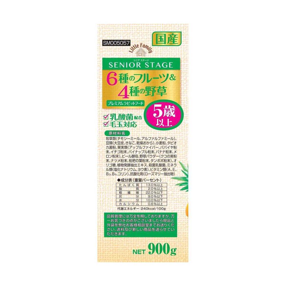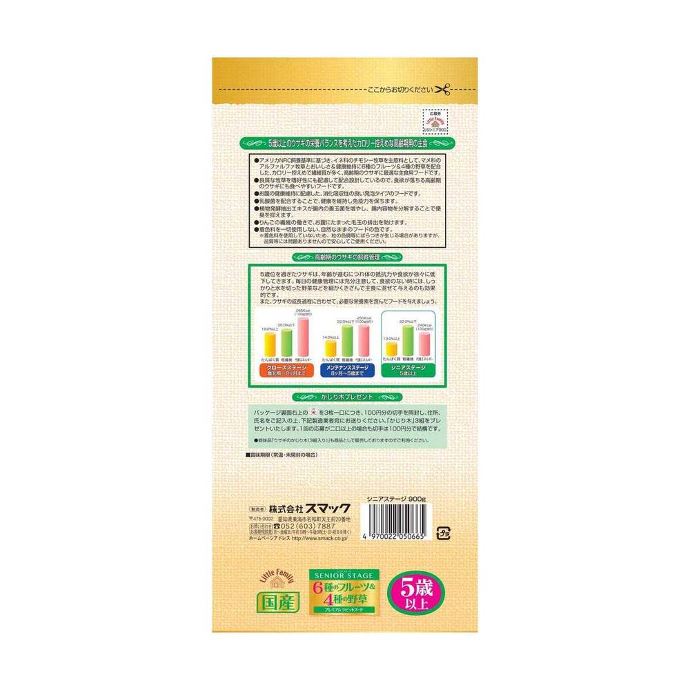 ライフステージに必要な栄養素を配合&6種のフルーツを4種の野草で嗜好性にもこだわりました。 5歳位を過ぎたウサギの栄養バランスを考え、アメリカNRC飼養基準に基づき配合設計した高齢期用のプレミアムフードです。 イネ科のチモシー牧草を主原料としたシニアステージは、カロリー控えめで繊維質が多く、高齢期に必要な栄養素をバランス良く配合した、高齢期のウサギに最適な主食用フードです。 また、5歳位を過ぎたウサギは、体の抵抗力や食欲が徐々に低下してきます。 高品質のチモシー牧草を主原料にしたシニアステージは、嗜好性にも配慮して食欲が落ちる高齢期のウサギが食べやすい配合設計で、お腹の健康に配慮した消化吸収性の良い発泡タイプのフードです。