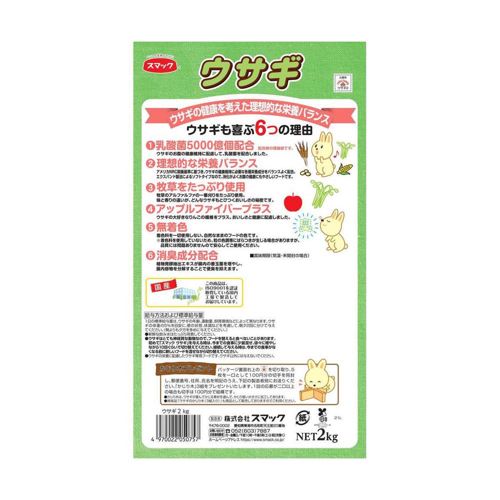 ウサギの健康維持に必要な栄養成分をバランスよく配合アルファルファ牧草をたっぷり使用。 アメリカNRC飼養基準に基づき、ウサギの健康維持に必要な各種栄養成分をバランスよく配合しています。 ウサギの大好きなりんごの繊維(アップルファイバー)を配合しているので、嗜好性も抜群です。 ウサギのお腹の健康維持に配慮して、乳酸菌を配合しました。 ソフトタイプなので、消化が良くお腹の健康にもやさしいフードです。 また、植物発酵抽出エキスが腸内の善玉菌を増やし、腸内容物を分解することで便臭を抑えます。