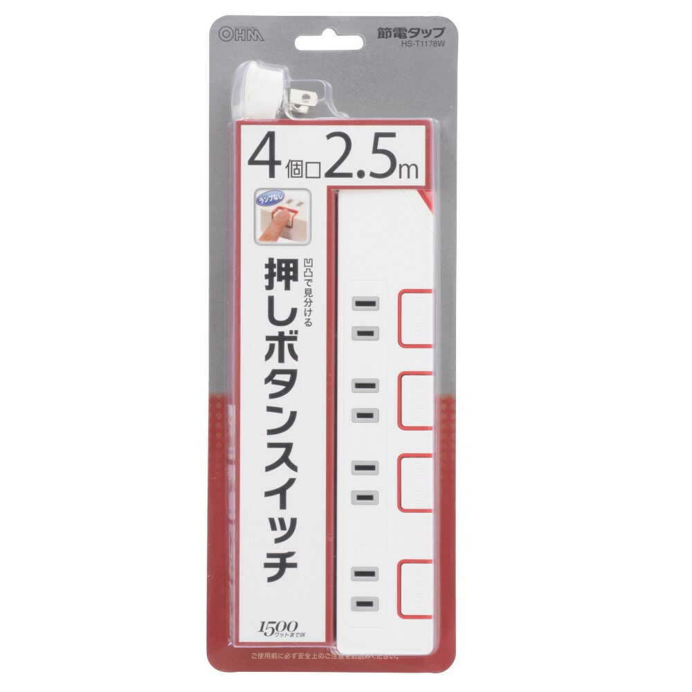 押しボタン式省エネスイッチ、難燃性樹脂使用、熱に強い、丈夫な二重被ふくコード、絶縁カバー付きL型プラグ