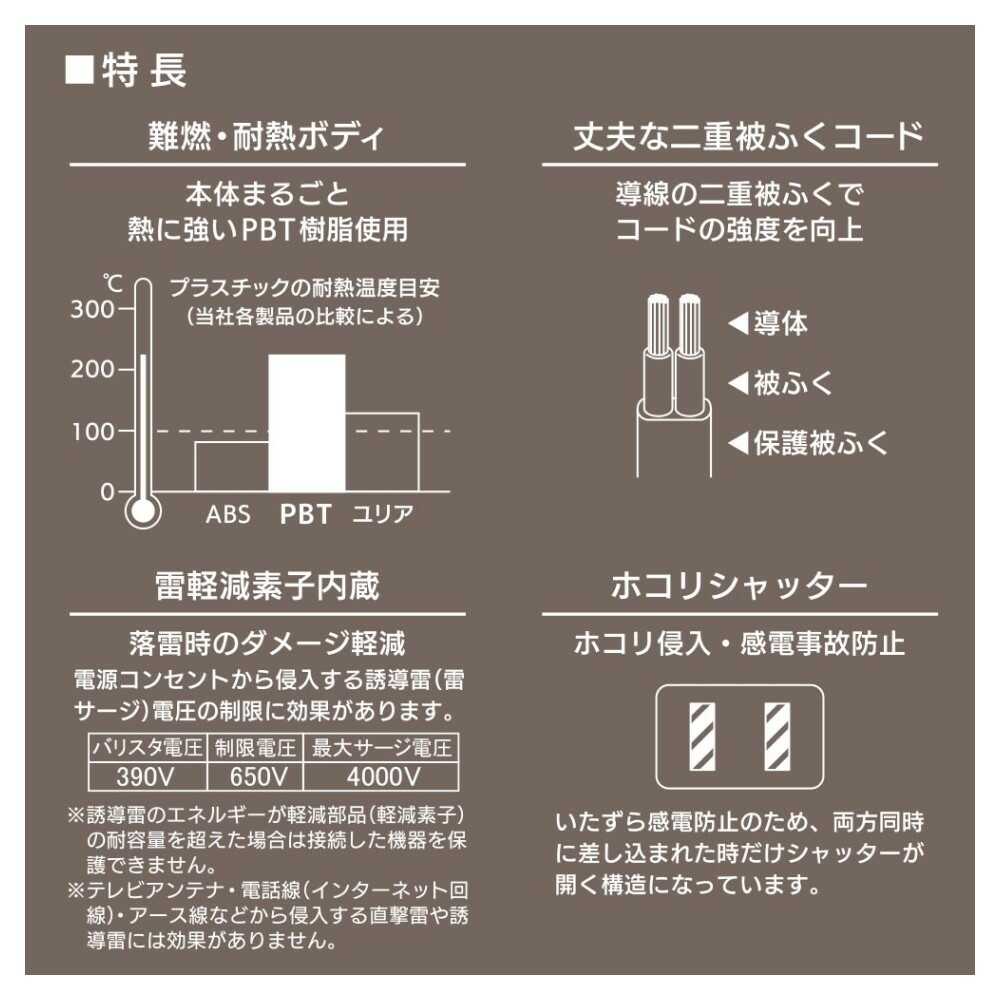 ● 雷軽減素子内蔵で落雷時のダメージ軽減 ● 本体まるごと熱に強いPBT樹脂使用 ● 導線の二重被ふくでコードの強度を向上 ● ホコリシャッターでホコリ侵入・感電事故防止 ● 本体カラーはホワイト ●コード長:5m