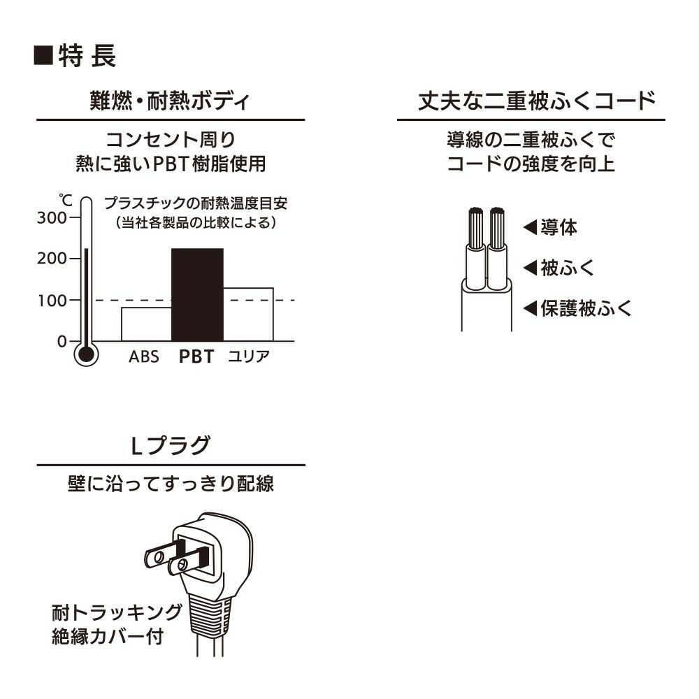 スペ-スを活かす、スリムボディ-、絶縁カバ-付プラグ、トラッキング火災を防止、丈夫な2重被ふくコ-ド