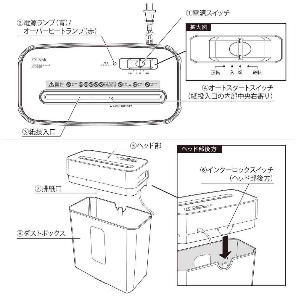 A4コピー用紙、最大3枚まで細断可能、2×11mmのマイクロカット、細断で情報をしっかりガード、定格時間 3分、モーターを過熱から守る、オーバーヒート自動停止機能、オートスタートスイッチ付き、ダストボックス容量11リットル、作動音約68dB