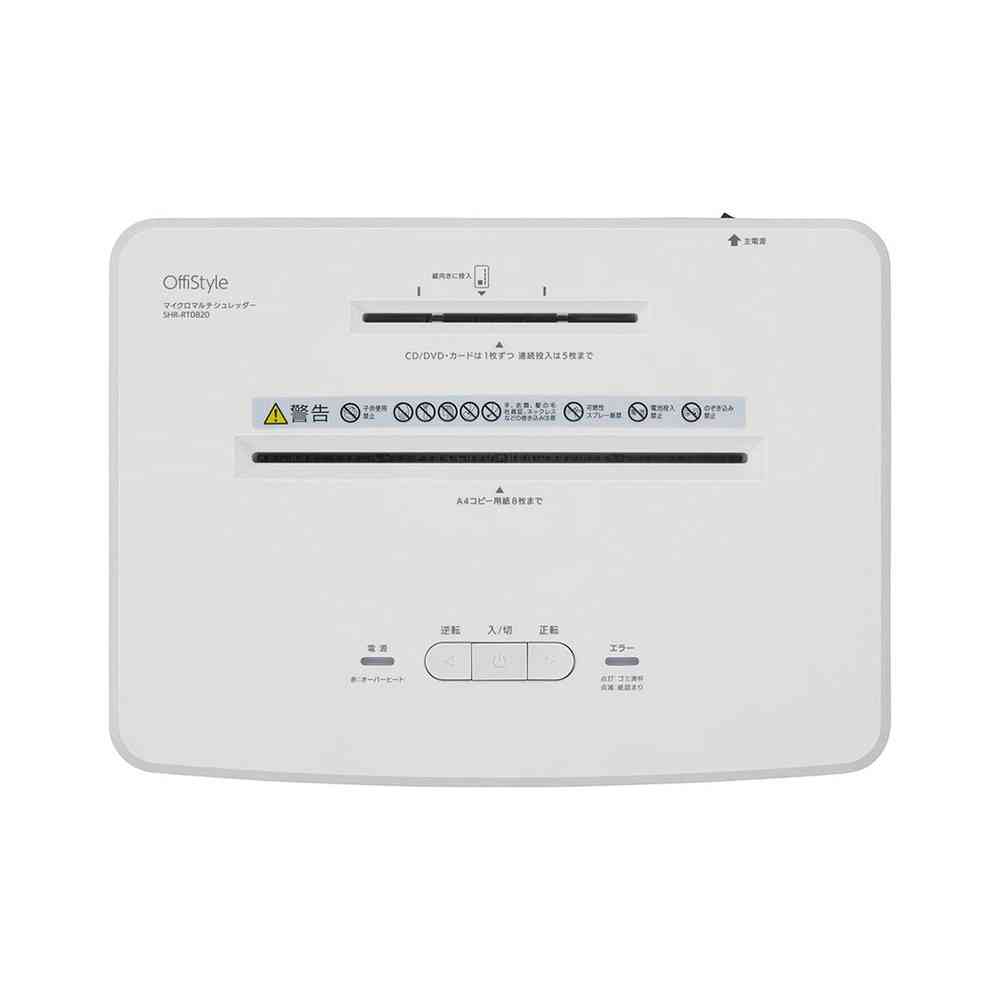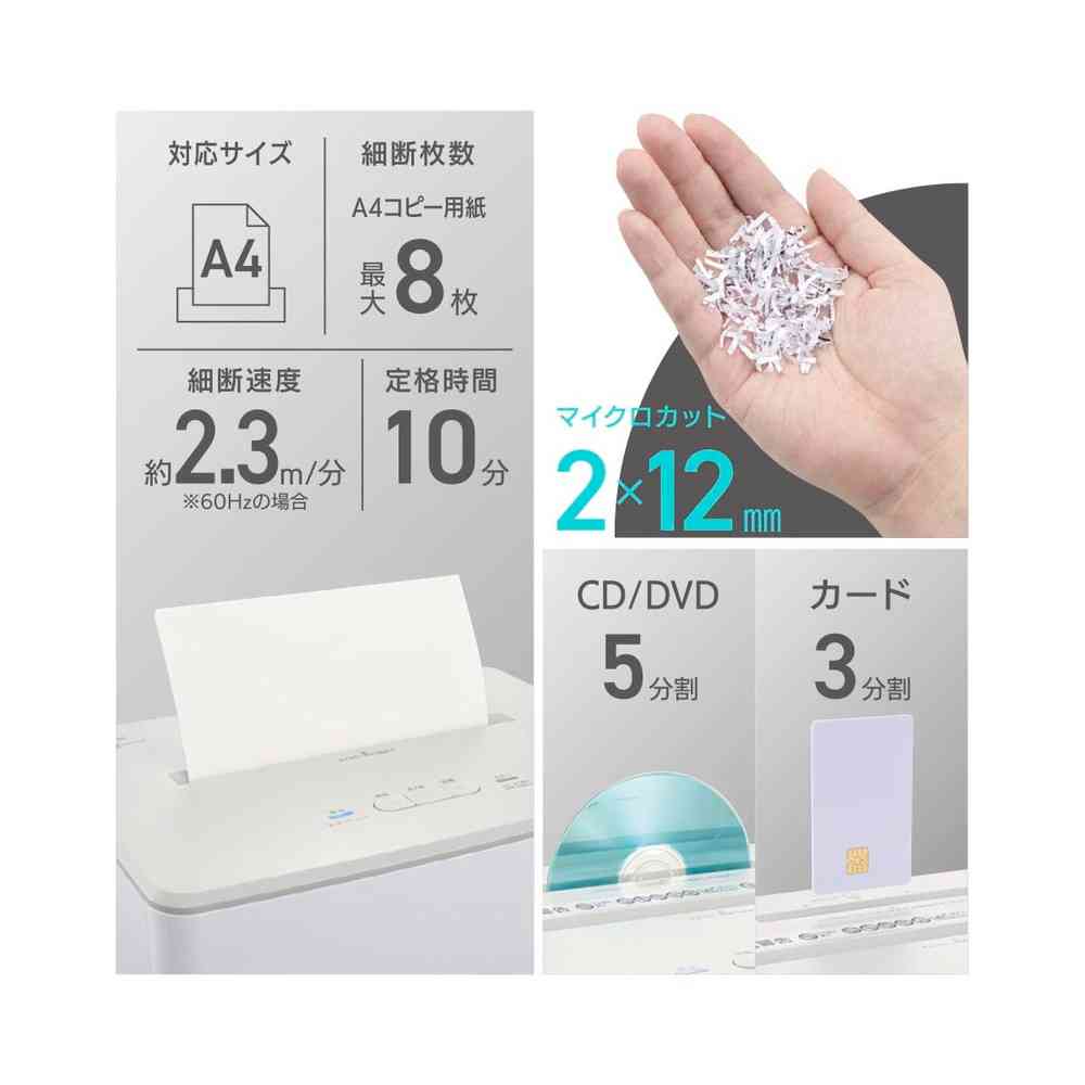 ● A4コピー用紙(64g/m2)を最大8枚まで細断可能 ● 作動音 約50dB(空転時、本体正面から1mの距離で測定) ● 定格時間 10分 ● 細断サイズ2×12mmのマイクロカットで情報をしっかりガード ● CD/DVD(5分割)、カード(3分割)細断 ● ゴミの分別に便利なメディアトレー付き(0.9リットル) ● キャスター(前輪ストッパー有)付き ● ゴミ袋がずれにくいマグネット付き ● 測定条件:室温20~25℃、相対湿度45~55%、A4コピー用紙(64g/m2)使用