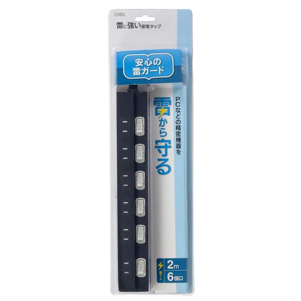PCなどの精密機器を雷から守る、雷に強い節電タップ、安心の雷ガード、熱に強いPBT樹脂使用、発熱を抑える、モジュール設計、耐熱性アップ、雷サージ軽減素子内蔵、ホコリ防止シャッター、燃えにくいコンセント周り、ACアダプターもスッキリ収納、スイッチランプもLEDで省エネ、トラッキング火災防止プラグ、壁にかけられるフック穴付き、黒