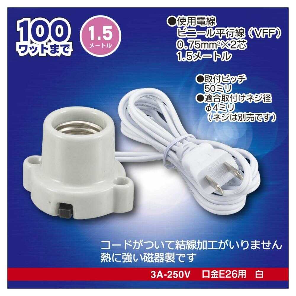 熱に強い磁器製、コードが付いて結線加工がいりません、3A-250V、口金E26用、100ワット、コード長さ1.5m