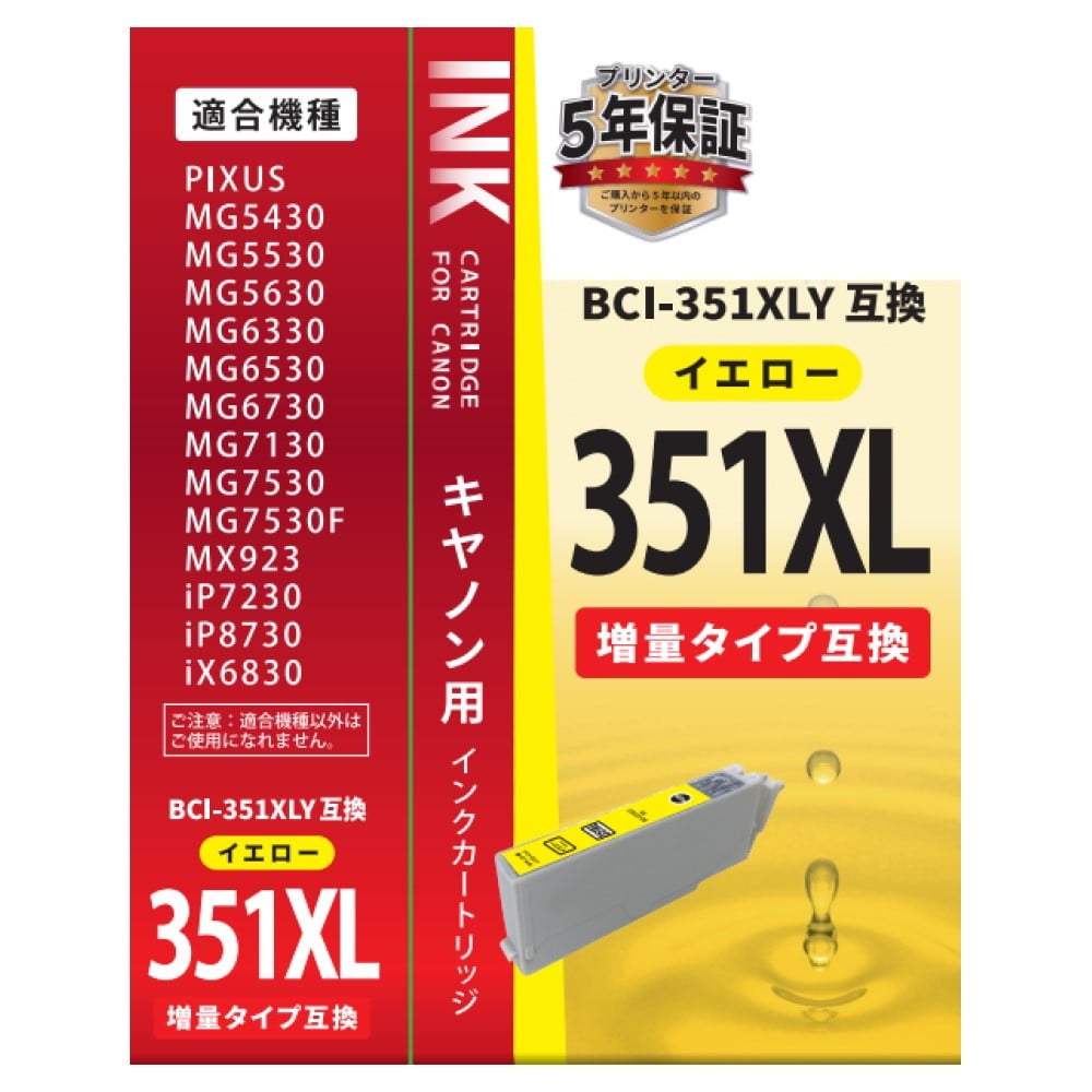 キヤノン、純正インクカートリッジ、BCI-351XLY、染料イエロー、互換インクカートリッジ、1個入り、残量表示完全対応、増量タイプ、プリンター5年間保証対象品