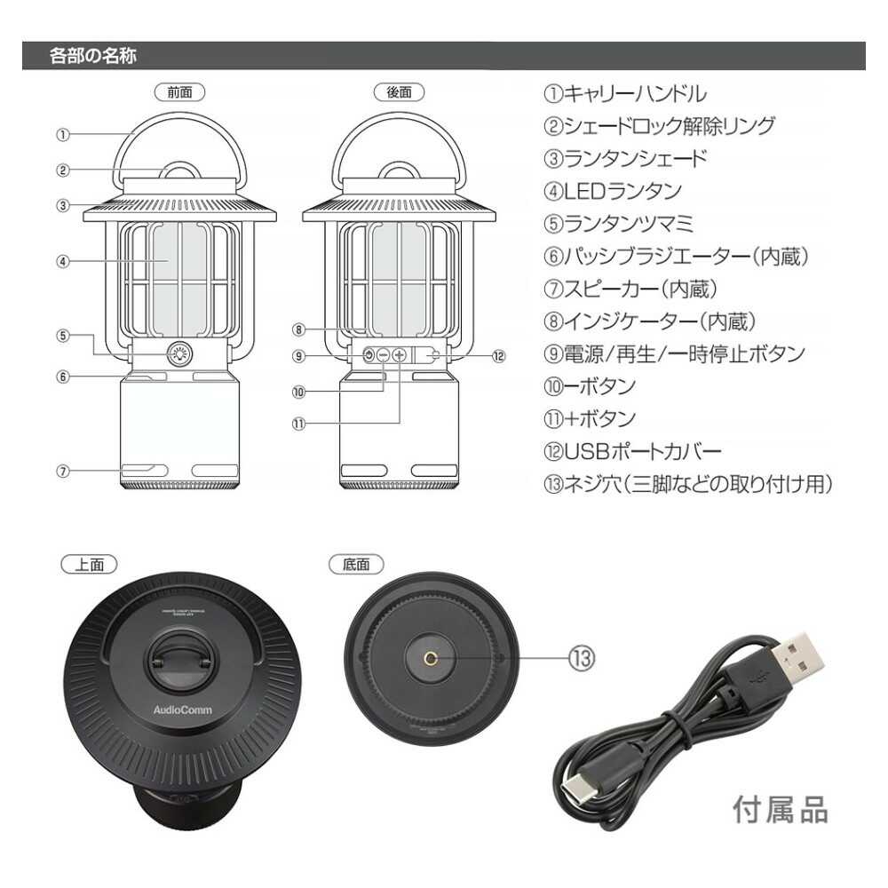 ● アウトドアを楽しくするランタン一体型高音質スピーカー ● ムードを演出する3つのライトモード(フレームライトモード、オレンジライトモード、ホワイトライトモード) ● 卓上ライトにも、ハンギングライトにもなる2ウェイ ● 高音質10W出力スピーカー ● ワイヤレス音楽再生(Bluetooth5.3) ● 低音強調パッシブラジエーター搭載 ● φ52mmフルレンジスピーカー搭載 ● USB-C充電式 ● 保護等級IP65の防塵防水形